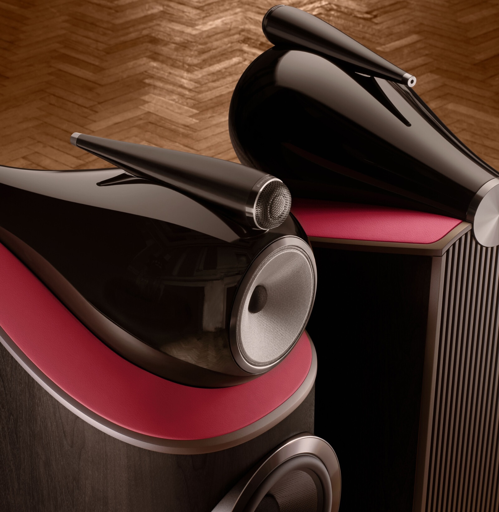 A closer look behind the scenes. Horns in Avantgarde Acoustic colour No. C5 “Red Giant”, ready for assembly.