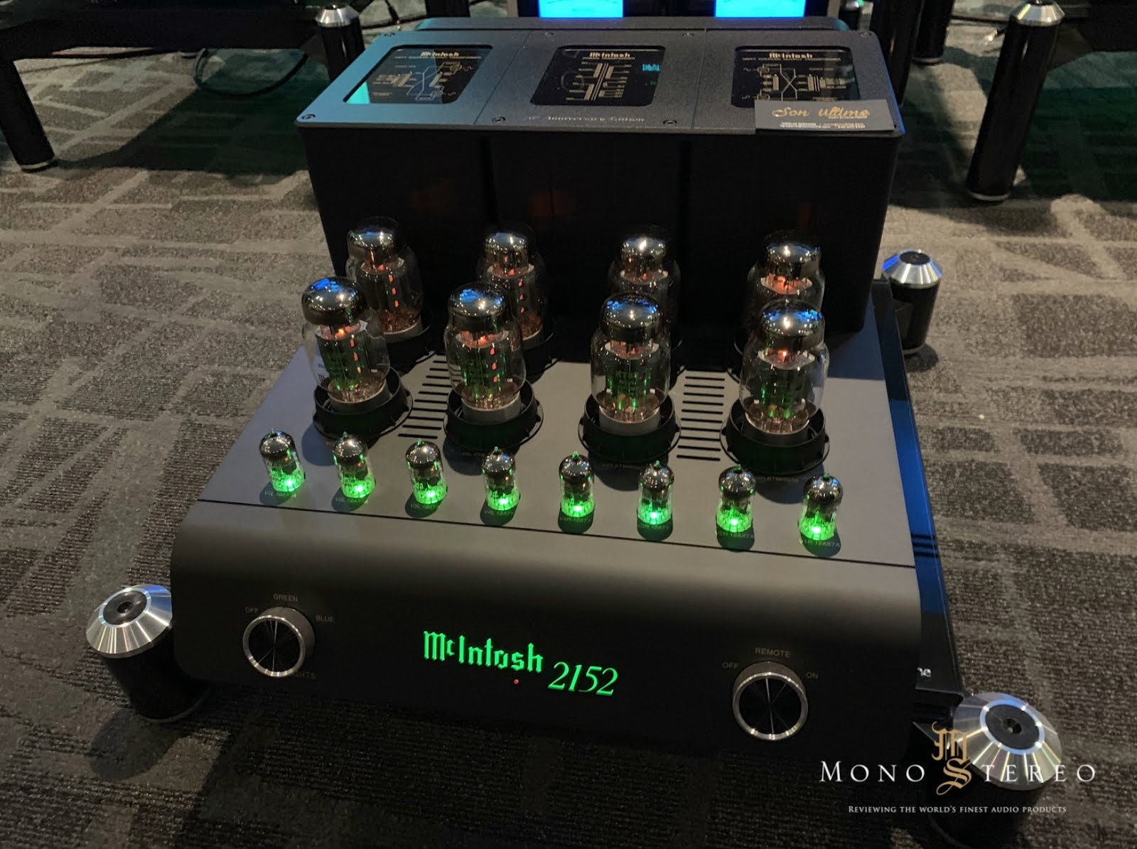 I have been looking forward to listening all-new MC2152, McIntosh newest 8 x KT88 tube amp as part of their 70th Anniversary Limited Edition Commemorative System (US$ 22,000), which comes with the Mac book and the C70 Preamp. The C70 and MC2152 are also available separately at $ 7,000 and $ 15,000 respectively. The MC2152 has circuitry which is similar to the MC275, except it has double the number of power tubes which brings output to 2x 150W. My enthusiasm was curbed when I found out that the MC2152 was not hooked up, but just plugged in for static display. I was surprised to see the amplifier being left on without load (speaker connection), probably not the best idea for a tube amp but perhaps they have some safety tricks which I wasn’t aware of.
