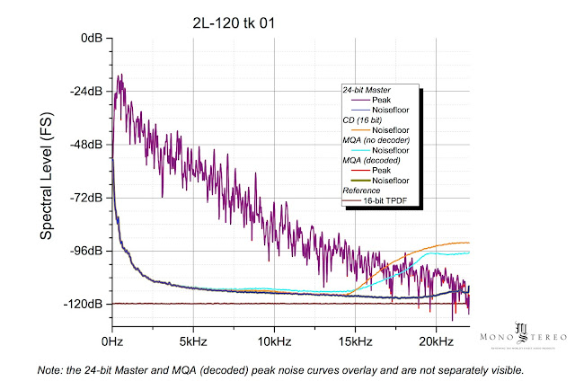We can also see that the shaped HF noise introduced by the MQA encoder and ‘heard’ without a decoder is removed by the decoder and is also below that of the CD release, even without decoding.