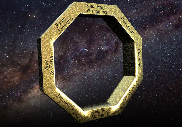 An unique thing about Aequo Audio, other than the shape of the Ensis and its new technologies, is their design-approach. It is driven by a model created over the years: the Octagon Model. This model was used to evaluate the performance of loudspeakers in general, and more importantly: to design new ones. The model describes eight areas in quality for a loudspeaker. Like Room Acoustics or Dynamics.