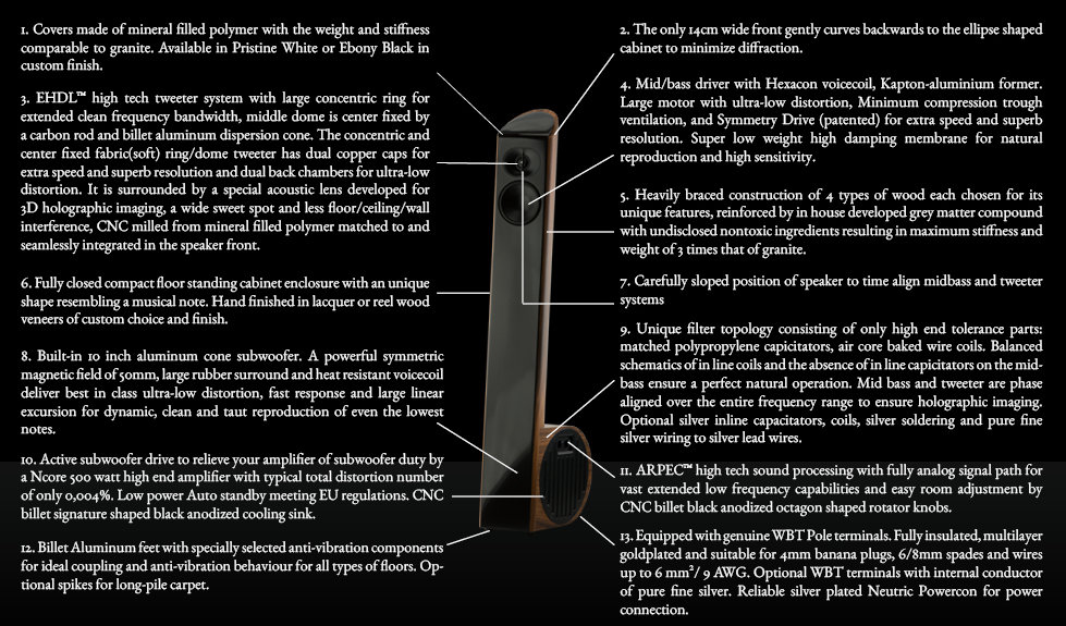 The Ensis is a very modest sized, truly full-range floor standing speaker. Its stylish shape resembles a music note. The fully closed enclosure is built with interesting in-house developed materials. It provides a three-way driver line-up, engineered to achieve exceptional precision and cleanliness in sound reproduction. This includes an active 10 inch subwoofer, controlled by an on-board amplifier and an analog hardware system for deep and natural lows. The hardware also provides a smart room size and speaker placement correction system, easily controlled by two stylish billet aluminum rotators.