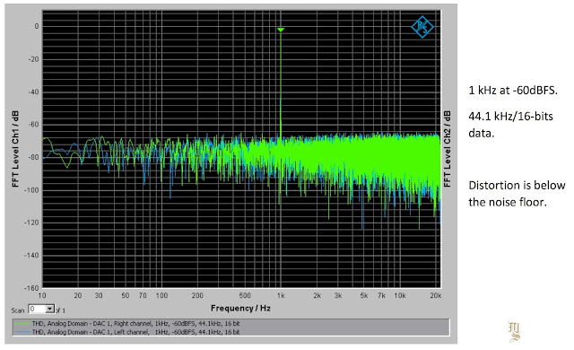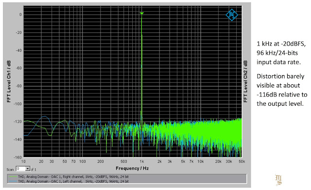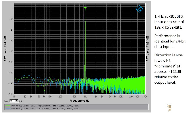 The actual DAC stage is a differential output (balanced) design. Its residual distortion is approximately 0.00035% at full scale output, consistent for all input formats. At typical output levels of -10dBFS the distortion falls off to 0.0001% (-120dB) and becomes essentially zero at levels below -20dBFS, “lost in the grass” as we say, at -130dB.
