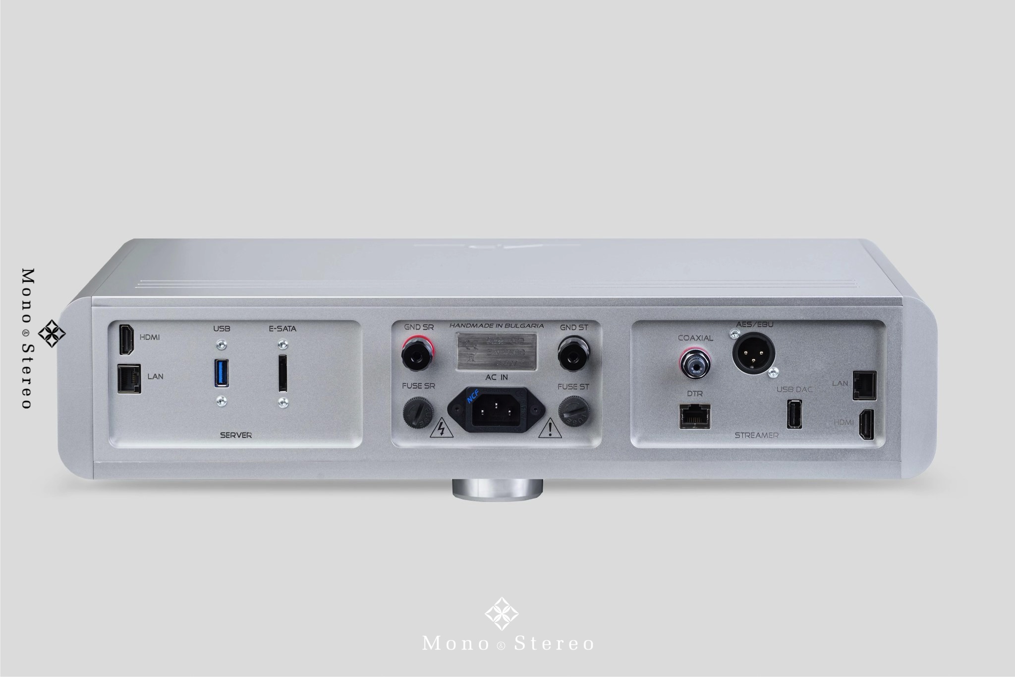 External storage may be connected to the USB or eSATA ports on the server side. NAS can also be used for audio files storage. The streamer side offers USB, AES/EBU and Coax for connecting DACs, as well as our proprietary balanced I2S DTR connector.