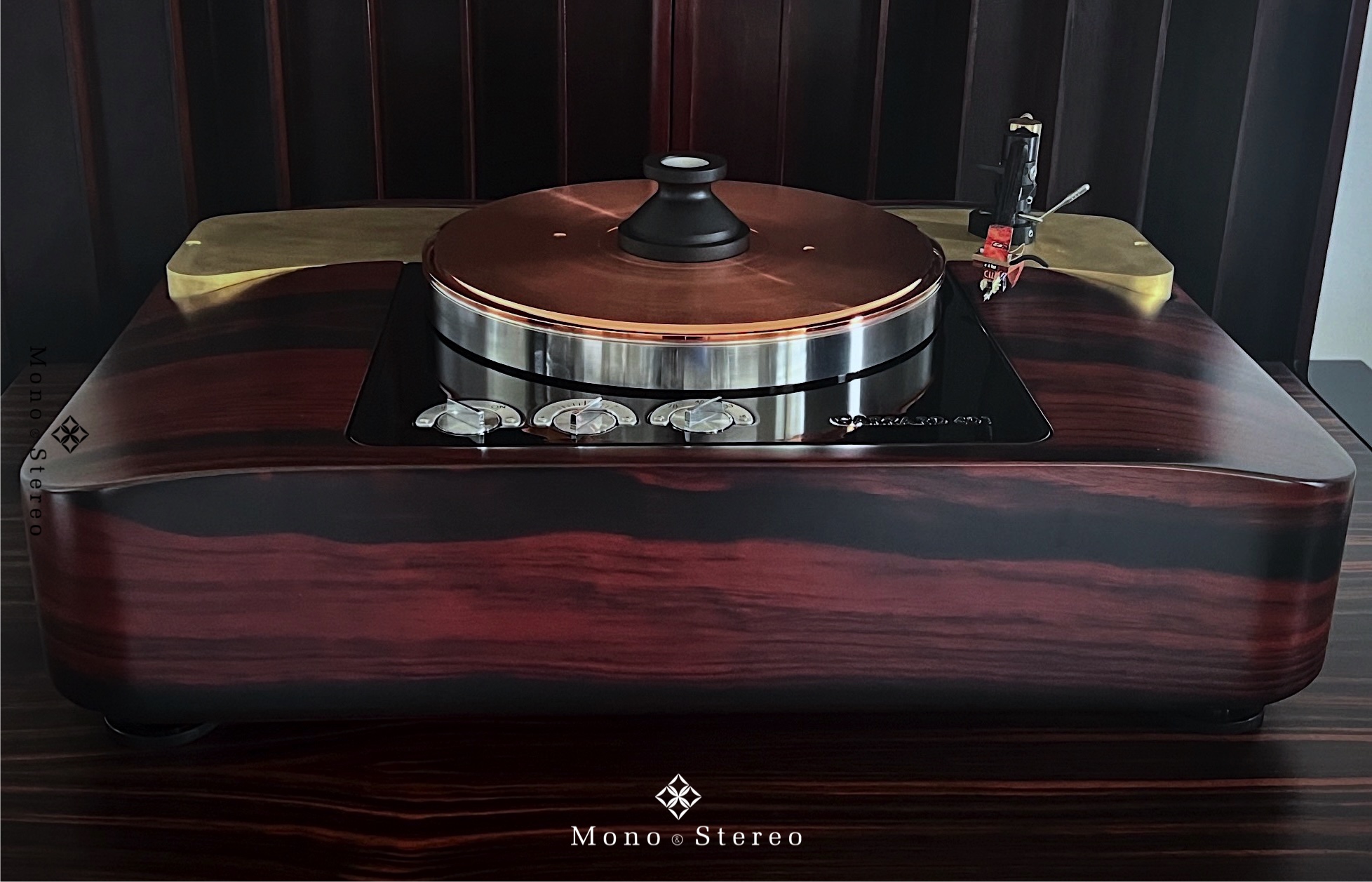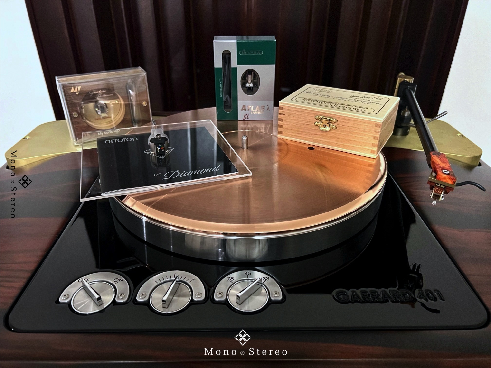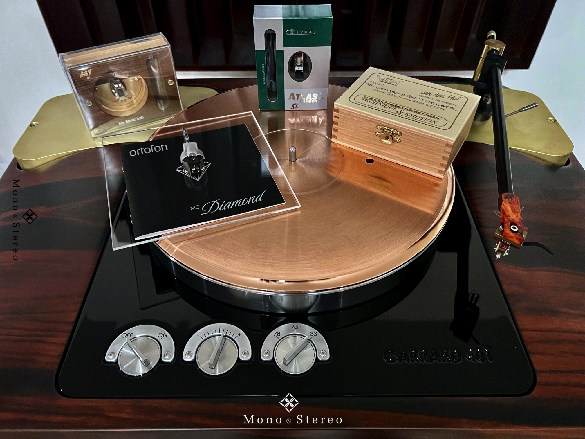 Artisan Fidelity Garrard 401 Statement SE Magnetic Bearing turntable in a Macassar Ebony veneer finish, placed on a FalkenOhr rack and paired with a summer cartridge lineup.