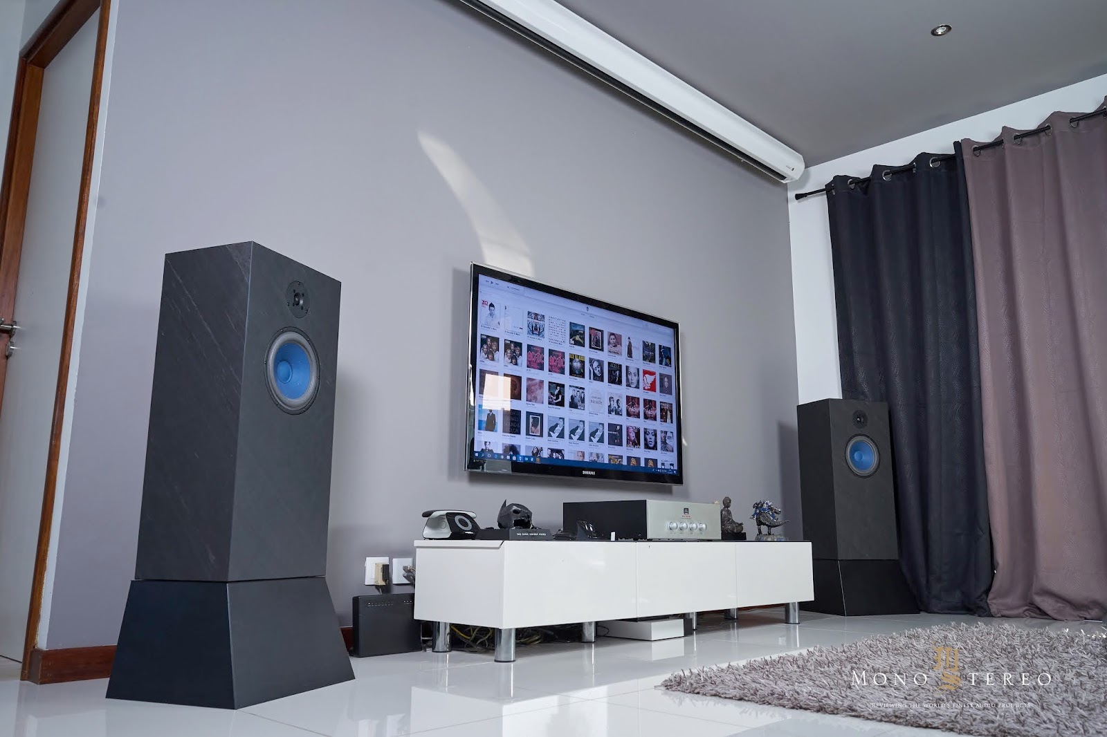 Yes, the real slate veneer as used with furniture. The full-blown Audio Note (UK) system of our friend Laurent Tolmé (UK) from Australia (New Caledonia). Audio Note (UK) Soro Line Single Ended (SE), AN -E HE Slate Edition SPe speakers, SPe speaker AN cable, Chord Mojo DAC, music stored on a NAS Synology DS620 with Roon as the main media player.