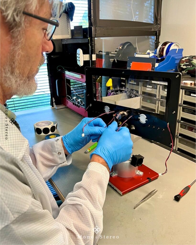After it is assembled, Barry puts the meter in the red faceplate jig to make sure it is working properly, with rows of LEDs behind to catch any flaws before it is added to inventory. The front panel with the Ghost Meter® is the final major part installed on a Reference amplifier before it goes into listening. Every piece is auditioned and carefully evaluated before it gets packed. The first photo is of the prototype panel for our next amplifier, the 320M.”