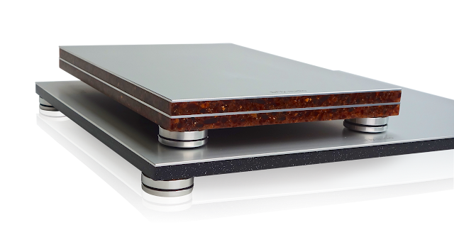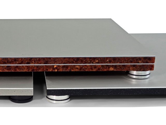 With the StoneLine bFly-audio presents a new absorber base suitable for HiFi components and loadspeakers. The core of the new StoneLine is a conglomerat of a fine-grained mineral stone and artificial resin. On the surface is a polymer bonded aluminium plate, which serves for an aditional isolation of vibrations and a reduction of electrosmog too.