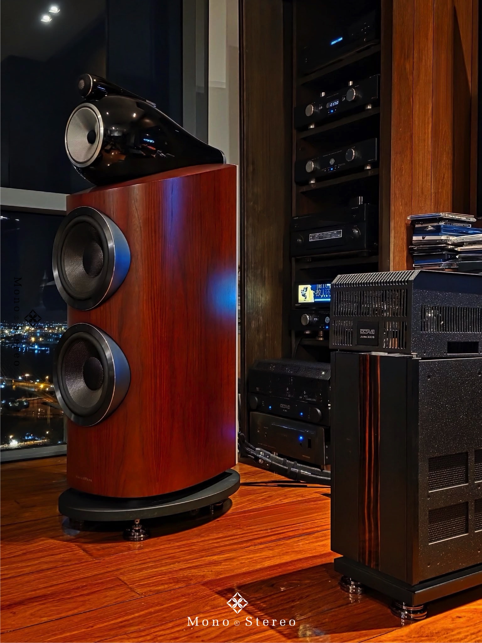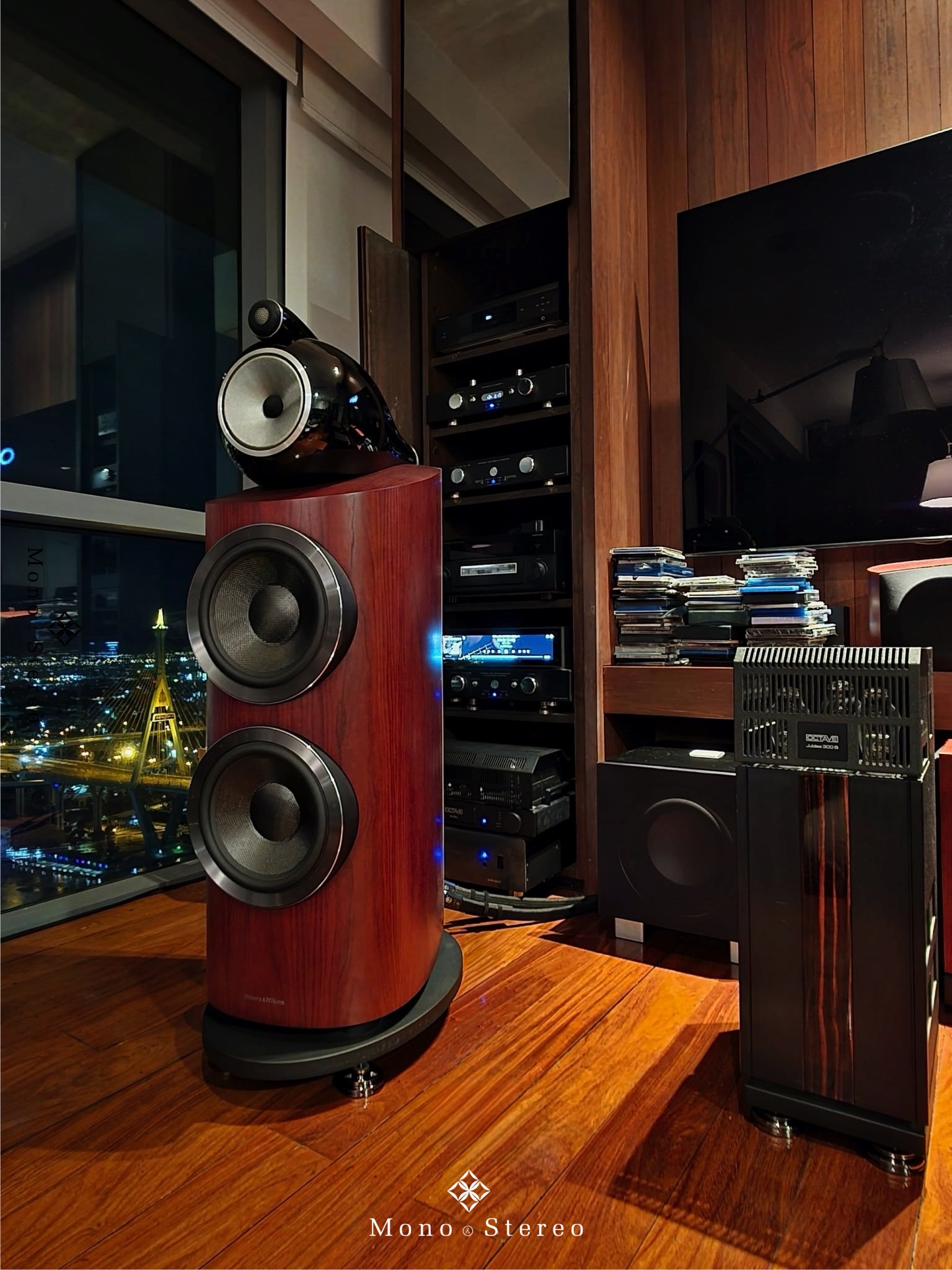 Bowers & Wilkins Diamond Series speakers placed on Life Audio Signature 2 SE speaker footers, paired with an Octave Jubilee 300B amplifier, along with Accustic Arts electronics.