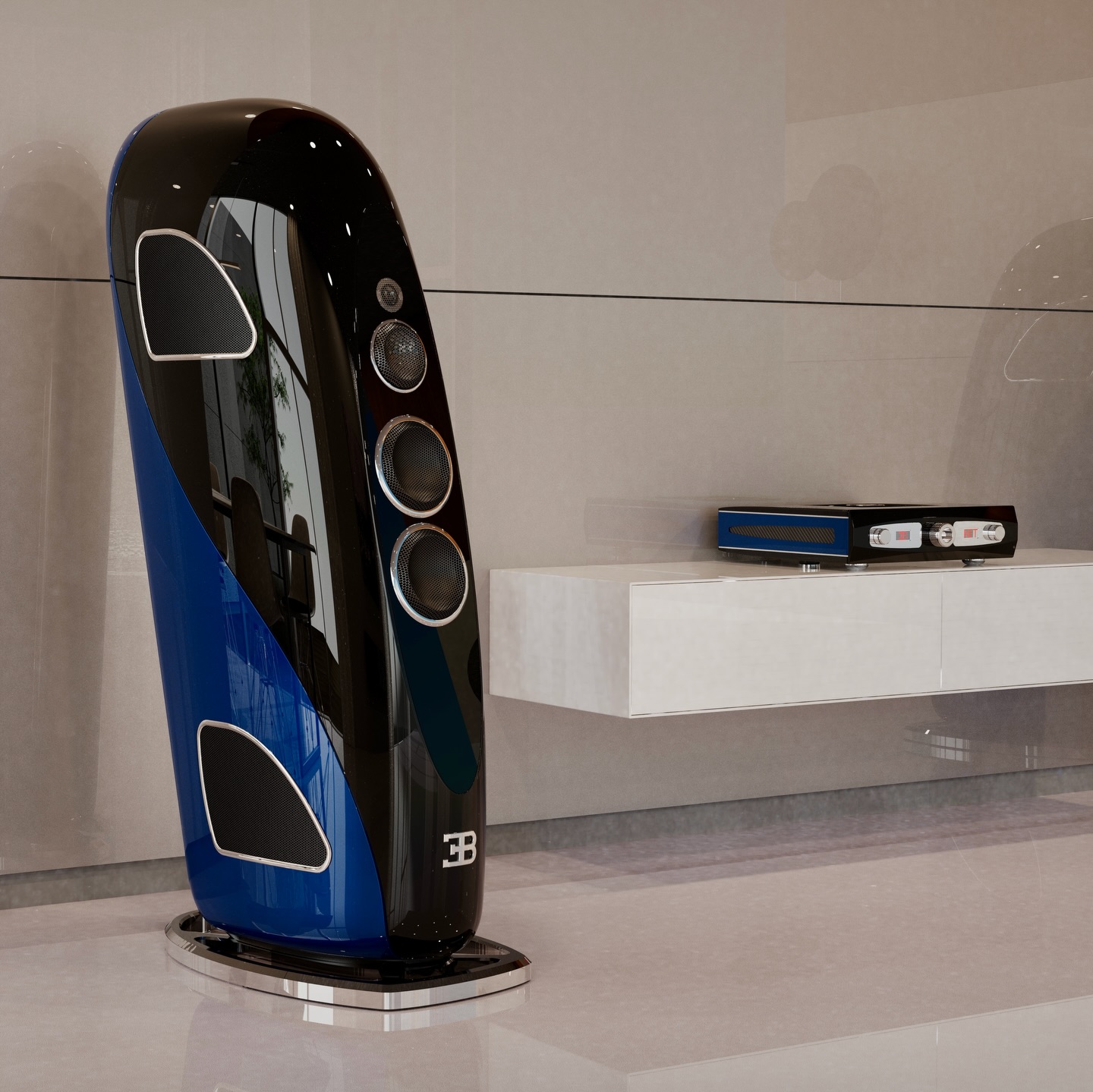 High-gloss Piano Black and striking Stardust Blue at the rear meet an anthracite metal front housing the unique diamond drivers — perfect sound dressed in elegant contrasts.
