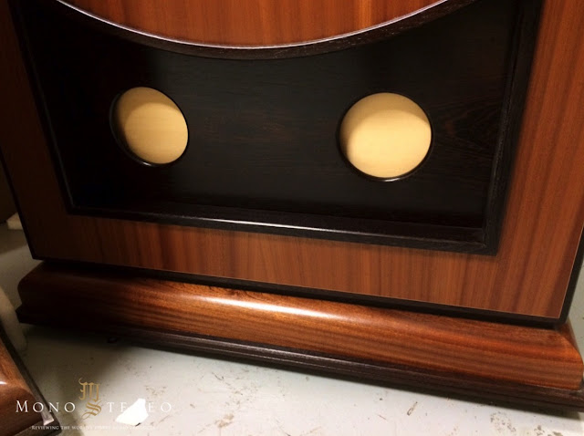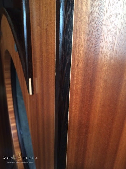 Gothenburg uses lots of solid wood parts such as the resonators and massive solid wood plinths with fine details such as micro inlays and solid wood corners. Note: the creamy coloured rare 6A white cedar resonator behind the dual pass-through holes.