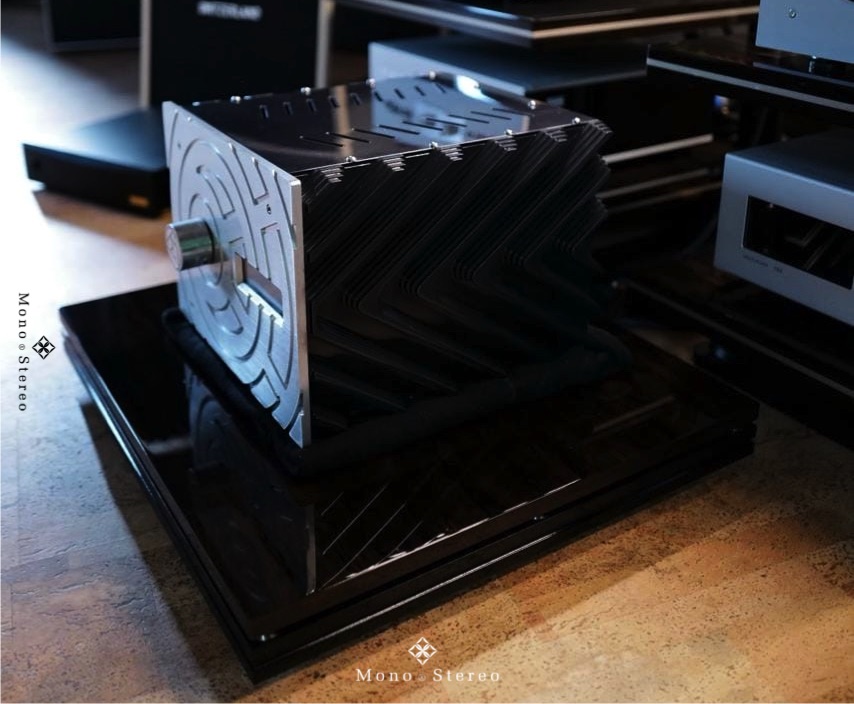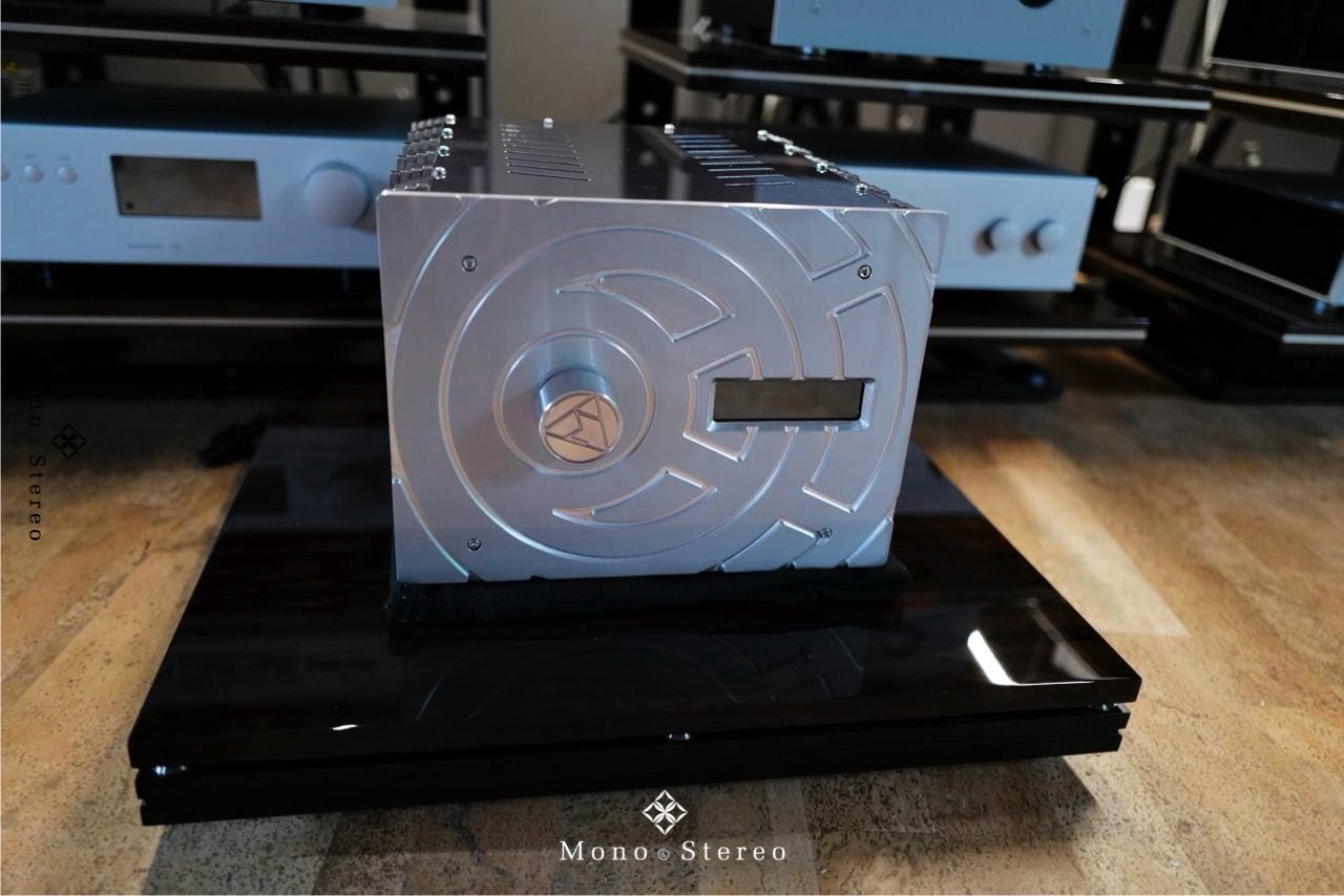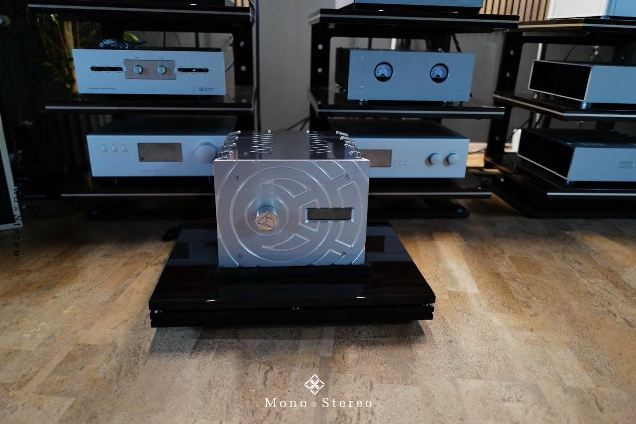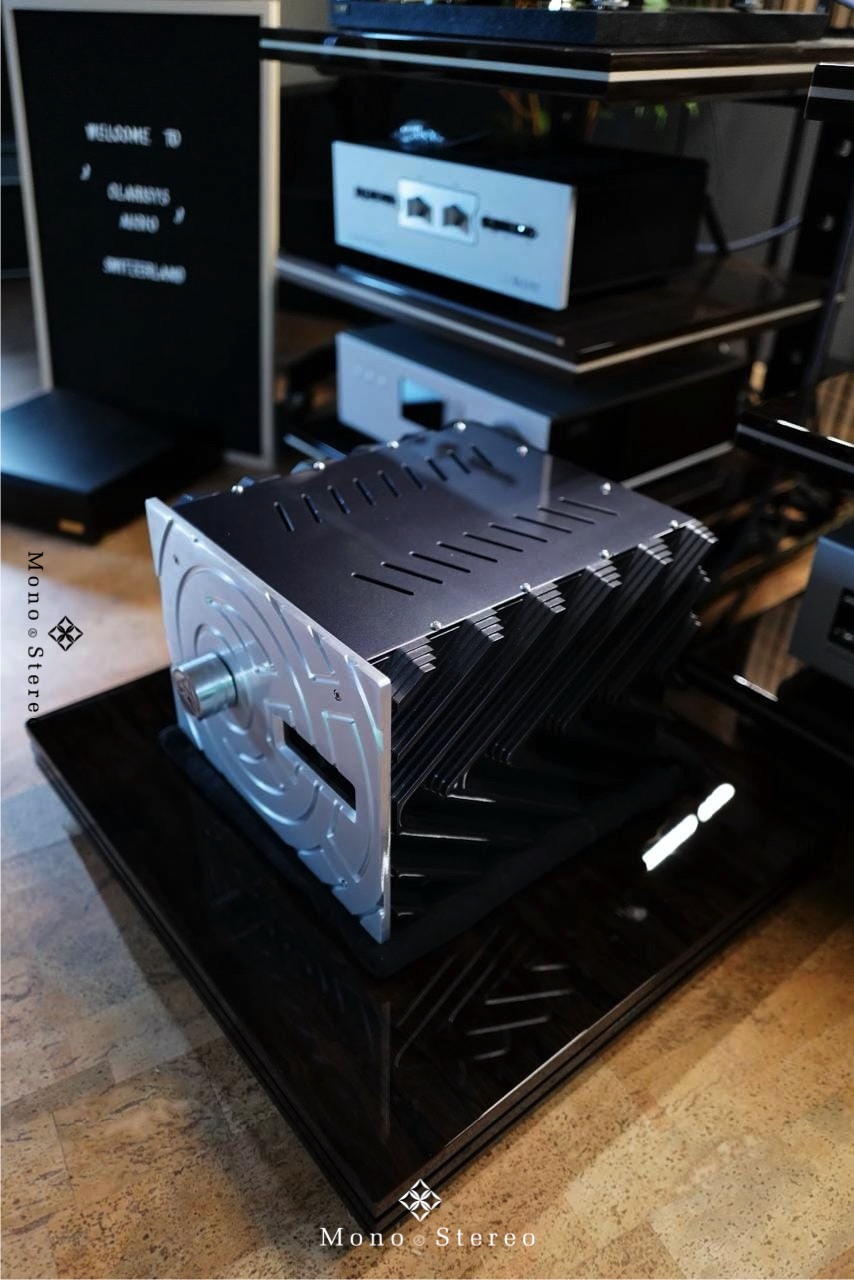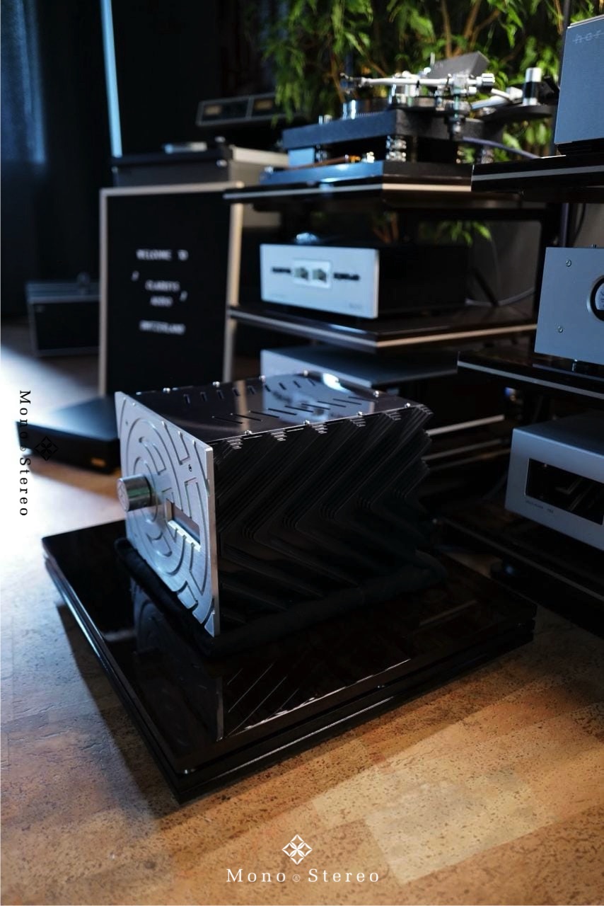 A new Delta Sigma Cit Swiss limited edition integrated amplifier at their Swiss distributor, Clarisys Audio, placed on the Ictra Design high-end audio amplifier base, driving Clarisys Audio speakers.