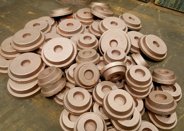A couple more shots behind-the-scenes of the DeVore Fidelity O/Reference speakers. These are the sand-cast bronze blanks that will be machined into the tweeter and super-tweeter chassis. “Some folks were hard to convince that the beautiful horns were cast–because the finish is so fine. Here is the “before” evidence.”