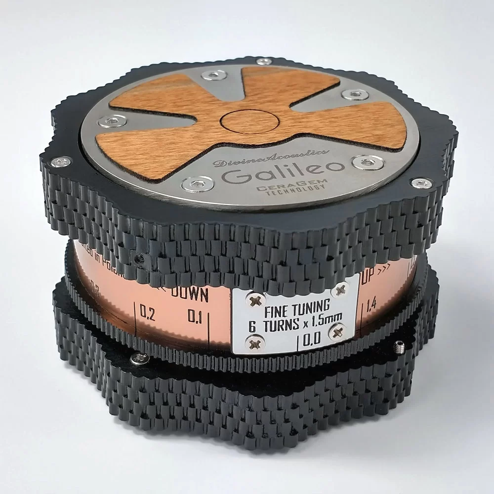 The resonance of a device is influenced by its mass, shape, external dimensions, as well as the materials from which it is made, and the arrangement of internal components such as the positioning of the transformer, mechanism, etc. Considering so many variables, in order for the anti vibrations feet to fulfill their function, they need to be “fine-tuned” to the device. The resonance adjustment in Galileo is provided by the regulation of the central pin. Its height can be adjusted by 8 millimeters through 6 complete rotations of the thread. Generally, the heavier the device, the lower the Galileo should be set. However, due to many other properties that also affect the inherent resonance of the devices, the final height of Galileo should be determined during listening sessions. More information on setting up and fine-tuning of Galileo can be found in the user manual.