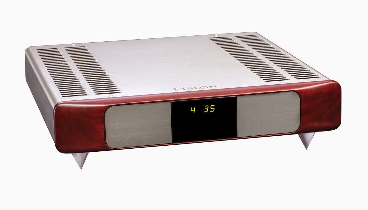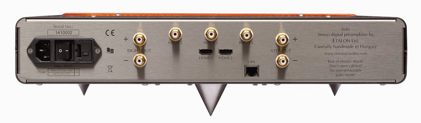 ETALON Solo is a company latest remote controlled multi-format digital preamplifier housed in a nonmagnetic cabinet with wood front. It spots 1 x Ethernet input for PCM 16-24 bits, 44.1-88.2-176.4 and 48-96-192 kHz standard audio formats and DSD (DoP protocol, single data density: DSD64).