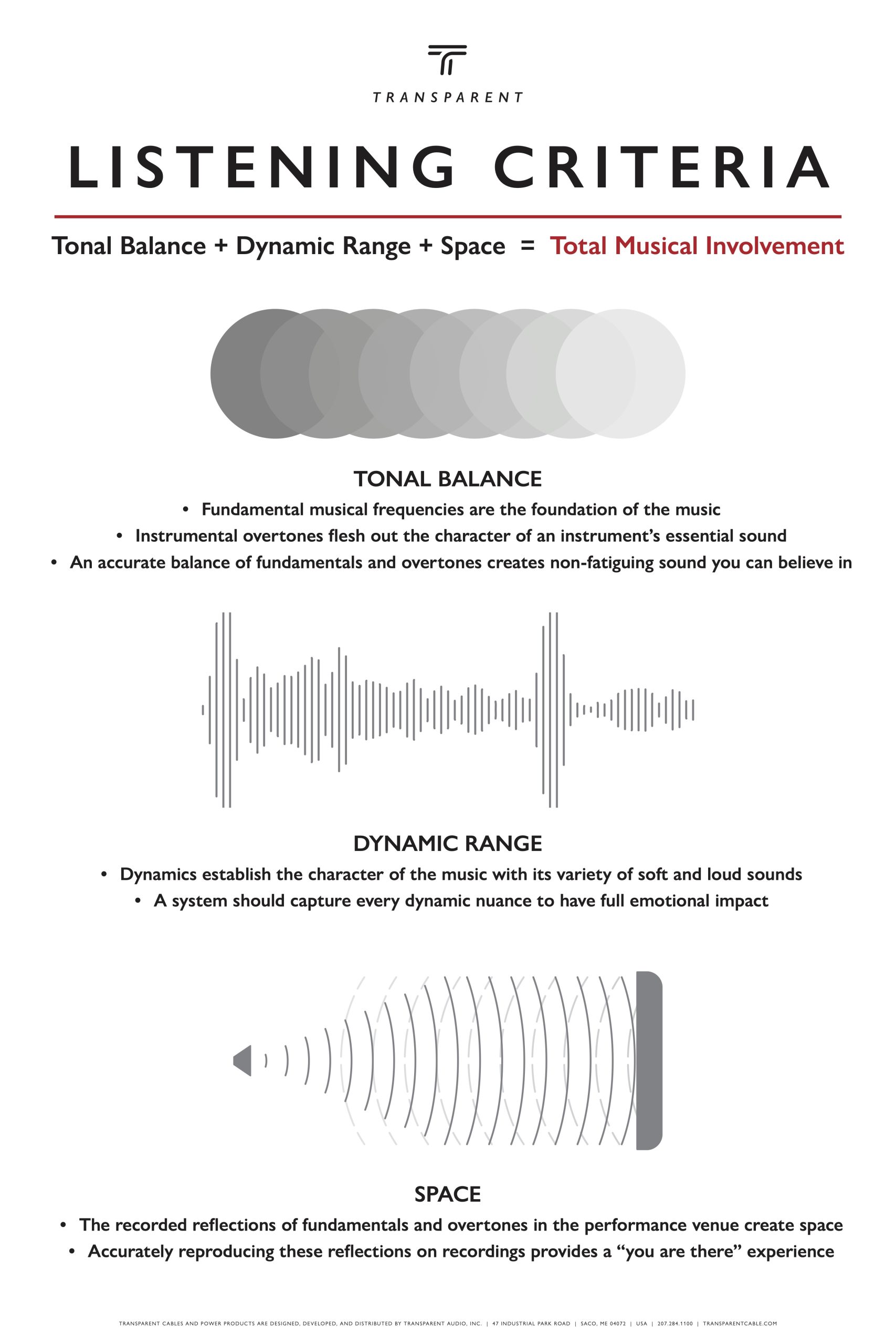 Design is an ongoing process at Transparent and live, unamplified music performed in a natural acoustic space is always our reference point. We require that design, sales, and marketing team members attend live, unamplified music performances on a regular basis. Our design team spends many hours each week in our listening studio evaluating each design and making incremental changes in electrical values until it authentically embodies our listening criteria of tonal balance, dynamics, and space.