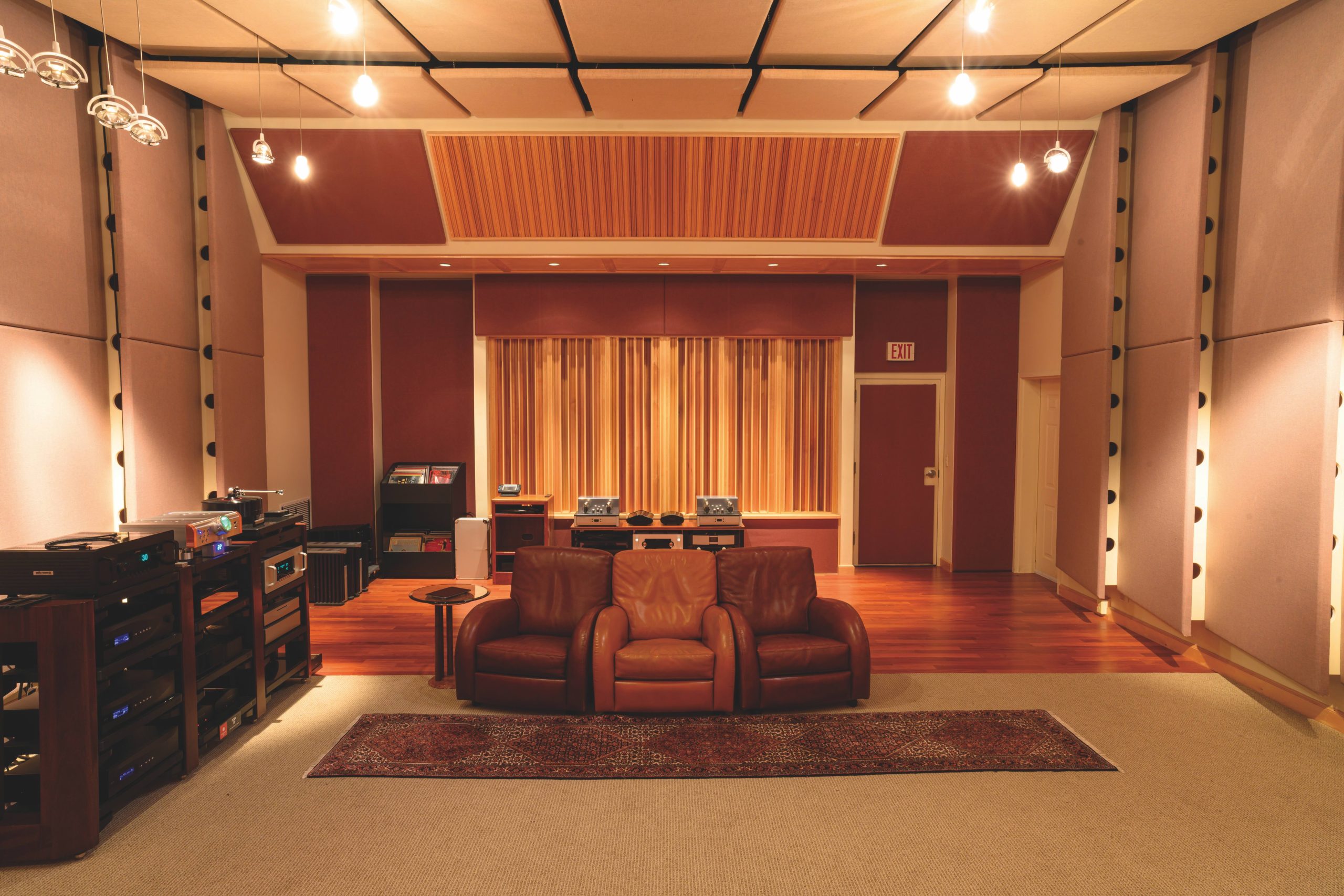 Five layers of staggered 5/8” sheetrock screwed and glued on an overbuilt stud and truss structure define the incredibly rigid outer acoustic space of the rooms. The rooms are completely isolated structures within their respective buildings with separate reinforced foundations and separate electrical and HVAC systems. An RPG acoustic shell in each room controls room nodes and spurious reflections.