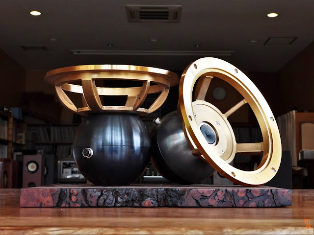 The “beauty” shots of Feastrex Naturflux -9e type-Ⅲ 100% Permendur spherical magnetic circuit driver with gunmetal basket on a solid wood burl plate with a handmade gold leaf logo engraving.