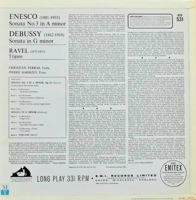 First produced in Great Britain on HMV ASD 531 White & Gold EW1 Stereo Label; Program: Enesco Violin Sonata No. 3 in A minor, Debussy Violin Sonata in G minor, and Ravel Tzigane. Christian Ferras , violin, accompanied by Pierre Barbizet on piano. – Saulo Zucchello