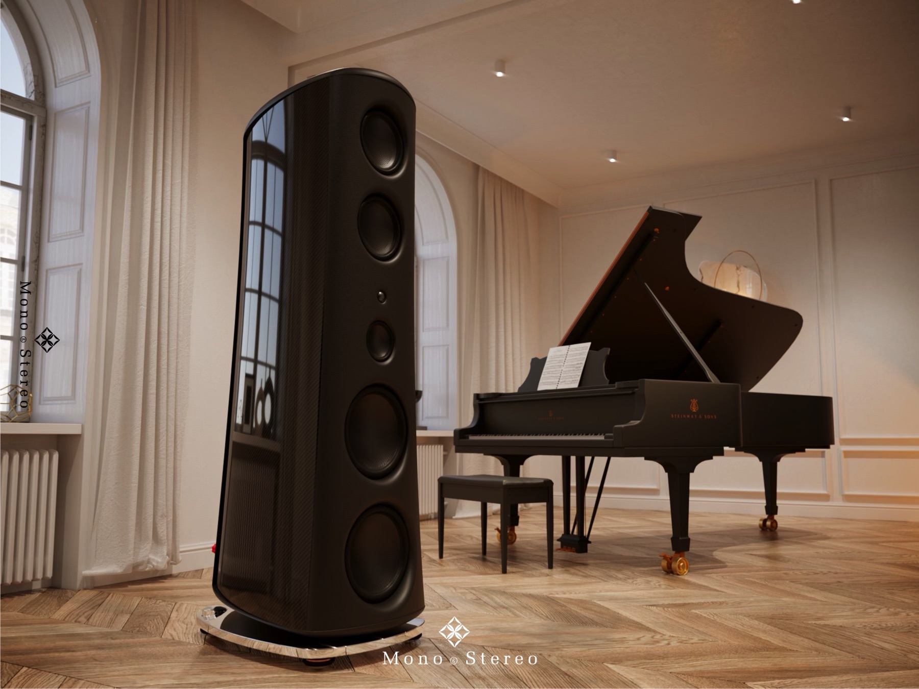 The M7 stands 65″ high, 22″ deep, and is 15″ wide. One M7 weighs 500 pounds, uncrated. It’s bass drivers (2) are 12″ in diameter, while its two midbass transducers are 9″ units. This allows for significant air movement below the frequency range handled by the 5″ midrange and 28mm tweeter. The M7 is easily capable of playing full-range in the largest of rooms, but is also suited to mid-sized rooms courtesy of its seal-box bass alignment, linear frequency response, and precisely controlled off-axis dispersion. The latter results in more predictable in-room response than competing designs. The M7’s high sensitivity, coupled with its high power handling, allows the M7 to display state-of-the-art dynamic range -from revelatory whisper-quiet details to bombastic musical crescendos, the M7 is always in its comfort zone.