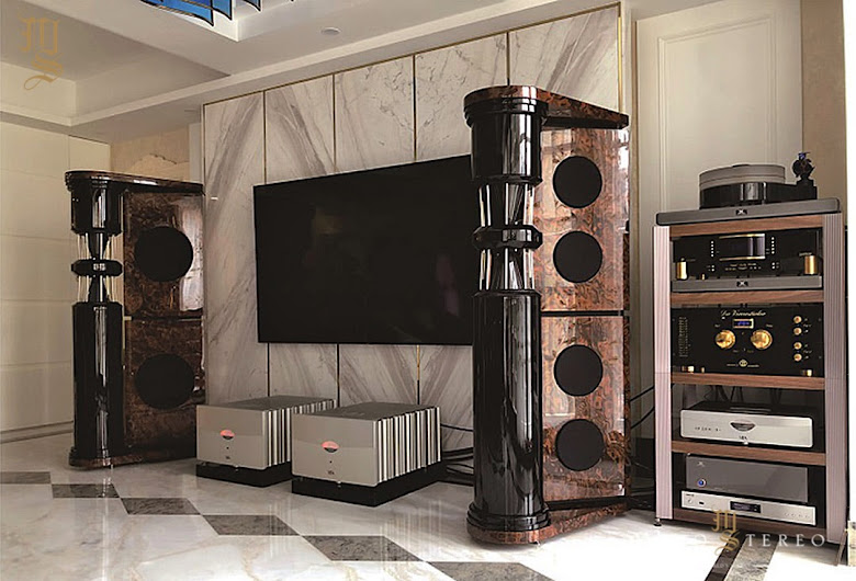 German Physiks PQS-402 loudspeakers in a customer’s system in China partnered with YBA mono power amplifiers, YBA CDT-450 CD transport, MBL Germany 1611A D/A converter, MBL 6010D pre amplifier Pro-Ject Audio Systems RPM-10 turntable, Melco Audio N1A-EX network player and Ensemble Fonobrio phono amplifier. The two omnidirectional DDD drivers on front of the PQS-402 cover the range from 215Hz to 24,000Hz. The bass system uses two 10-inch woofers and four 8-inch passive radiators to take the response down to 24Hz.