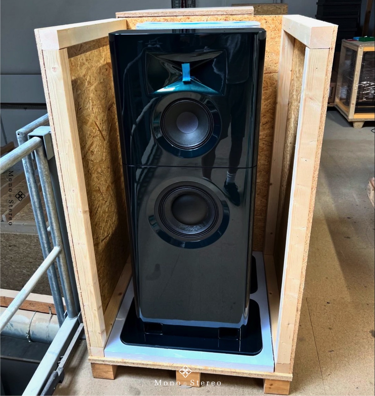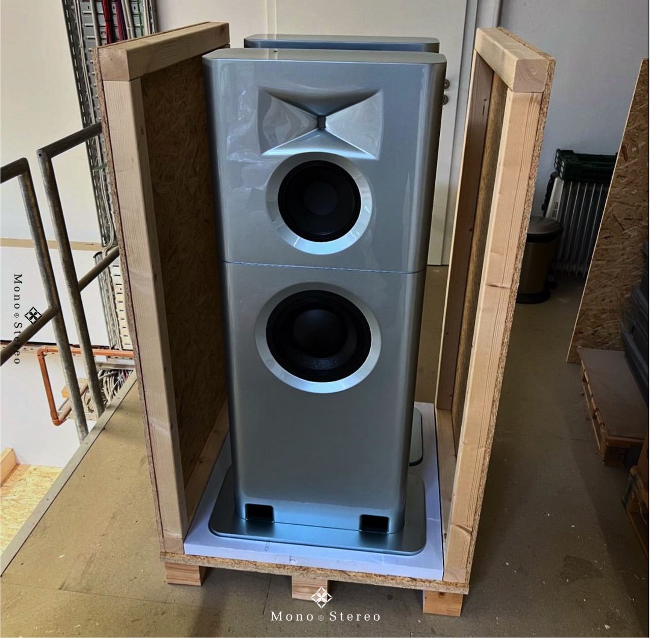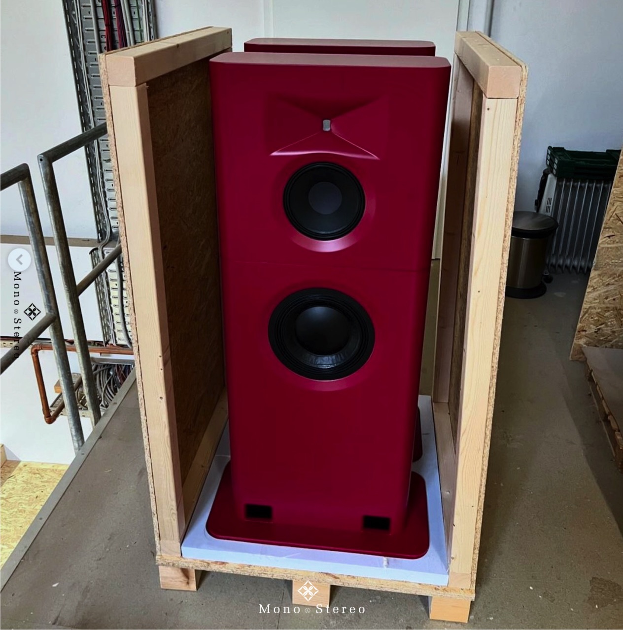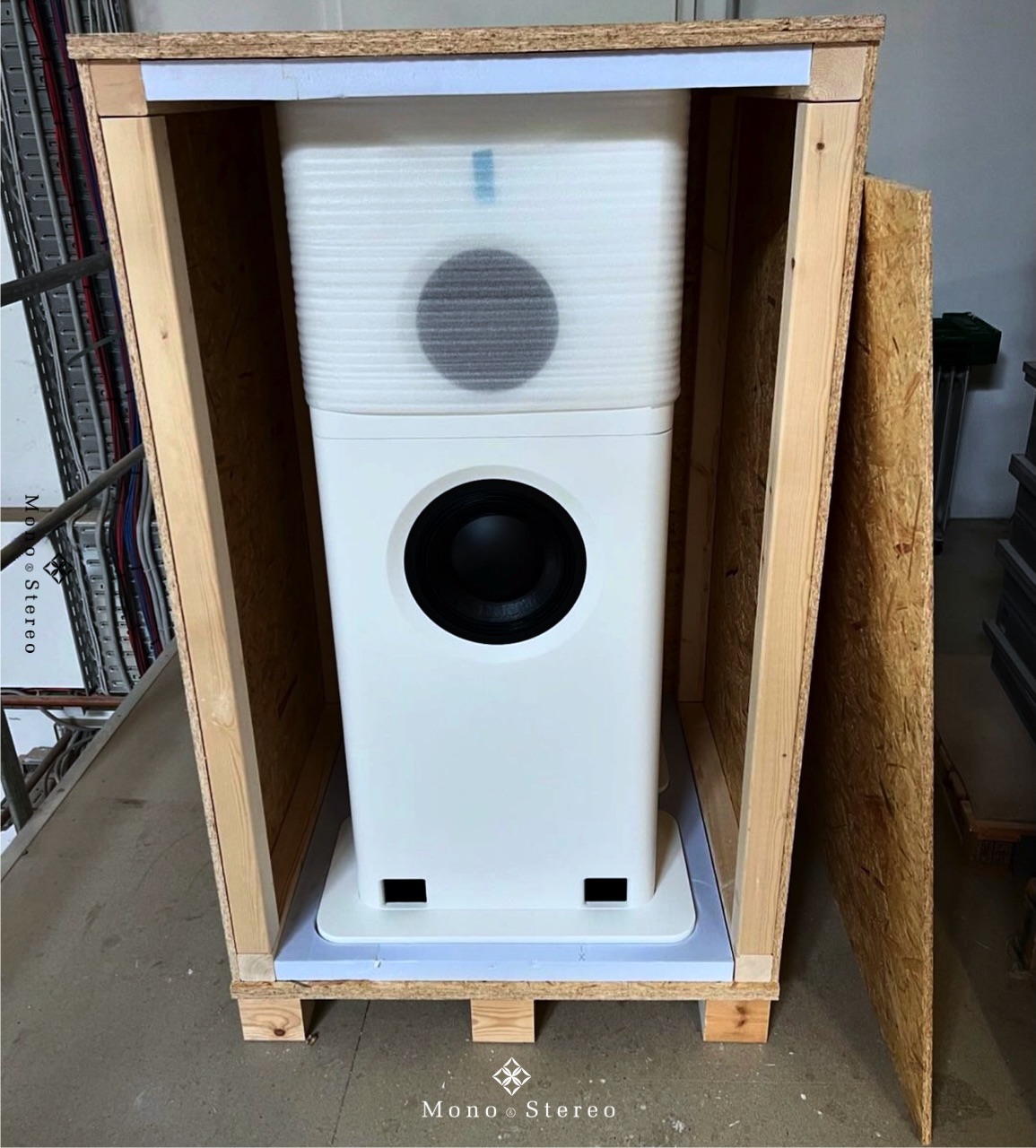 A batch of GGNTKT Audio Model M3 speakers in white, red, dark green metallic, and silver blue metallic is ready for shipment.