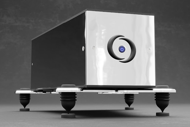 TThe entire amp is mechanically grounded for vibration control. The chassis is made of stressed brass and aluminum to deal with any vibrations within the component. The brass back plate and bottom plate are coupled with brass standoffs that apply a small amount of stress to the circuit boards. This stress helps move vibrations more freely to the brass stands and off the bottom plate. The bottom plate is coupled to specially designed brass points, stands and footers. The footers can also be filled with dampening liquid if so desired.