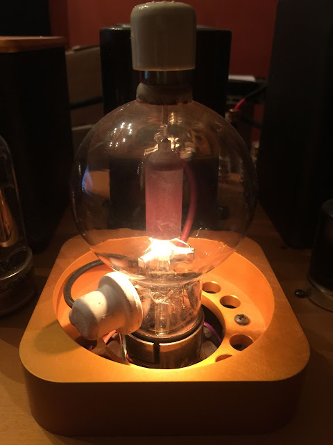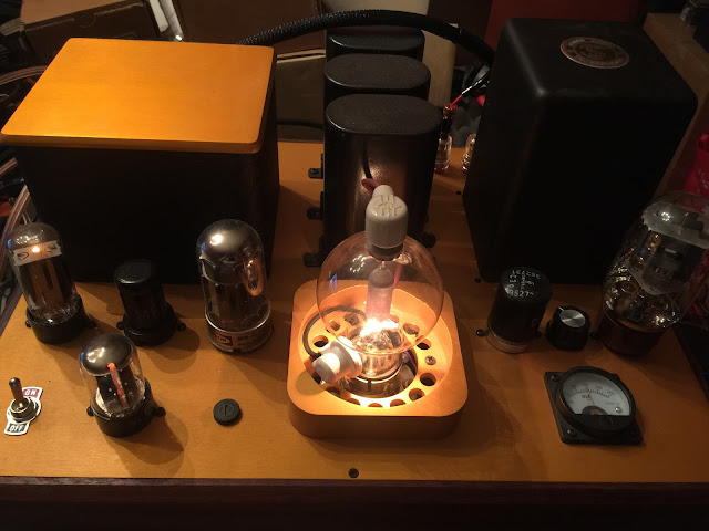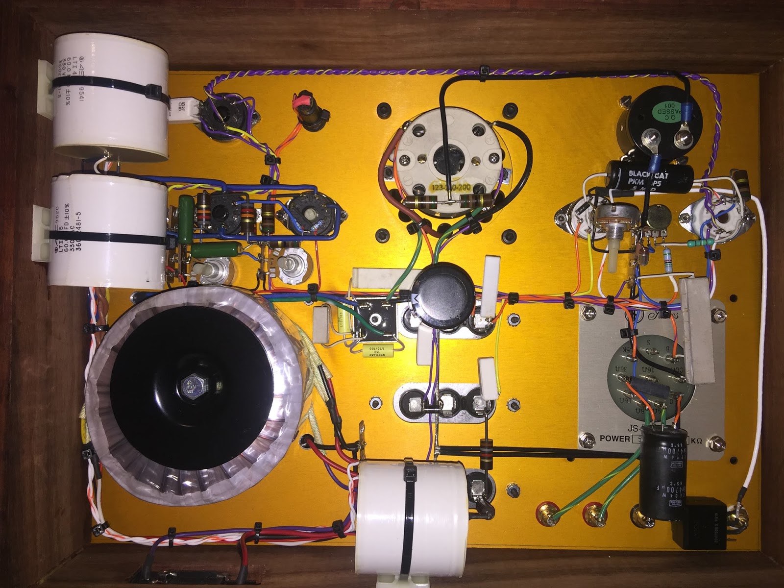 Ho Ngo writes: “One of the most beautiful tube, 808 DHT transmitting tube, and beautiful sounding too! Also known as Tennis Ball tube. Running in Class A2, 350 Volts @ 100 mA, it will put out comfortably 10 Watts SE. Circuit using C3G (triode mode) drive KT66 cathode follower directly coupled to 808. Transformer is limited to 100mA, or I would have push the tube more to get close to 15W. Power supply is more complicated than SE circuit, using two regulators, for output and driver.”