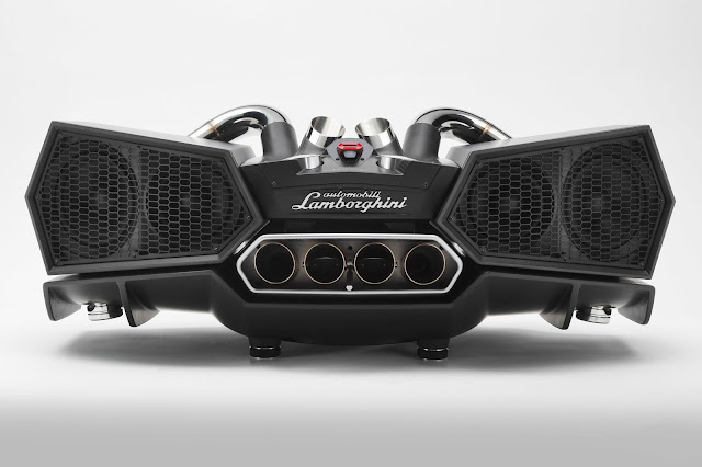 ESAVOX has been designed on the idea that style follows instinct. Meticulous research of the Lamborghini design has led to the creation of an object that immediately recalls the style of this renowned car designer. The original Lamborghini exhaust harmonises the dimensions of the docks, creating hexagonal effects and enhancing the selection of various materials. The design is based on single block cabinets in carbon and wood, recalling the most iconic features of Lamborghini cars.