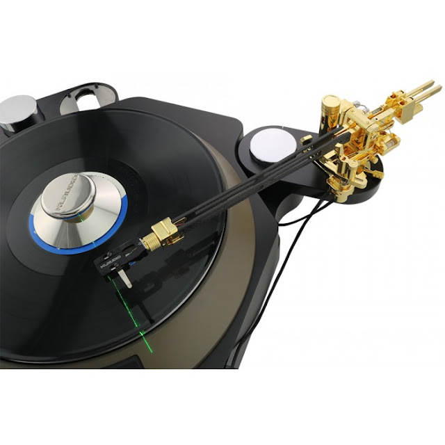 Klaudio model KD-ARM-AG10 (10.5-inch equivalent) tonearm add automatic lift and electronic descent features to the tangential lineup. The arms can be dropped or raised at the press of a button, and they automatically lift at the end of playback. These versions are gold plated with carbon fiber arms.