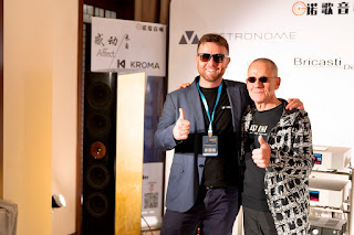 “Great success for Krom, that introduces new dealers in Hongkong and mainland China. First picture Cayetano with Elektra by Kroma. Second picture Norbert Mundorf and Cayetano signing the “thumbs up agreement”, as Mundorf components are implemented on the hand-crafted Kroma cross-over. Based on future engineering of Kroma products, they may use a new tweeter with the latest technology made by Mundorf in Cologne, Germany. Third picture, the small Mimis with carbon fiber black finish.”