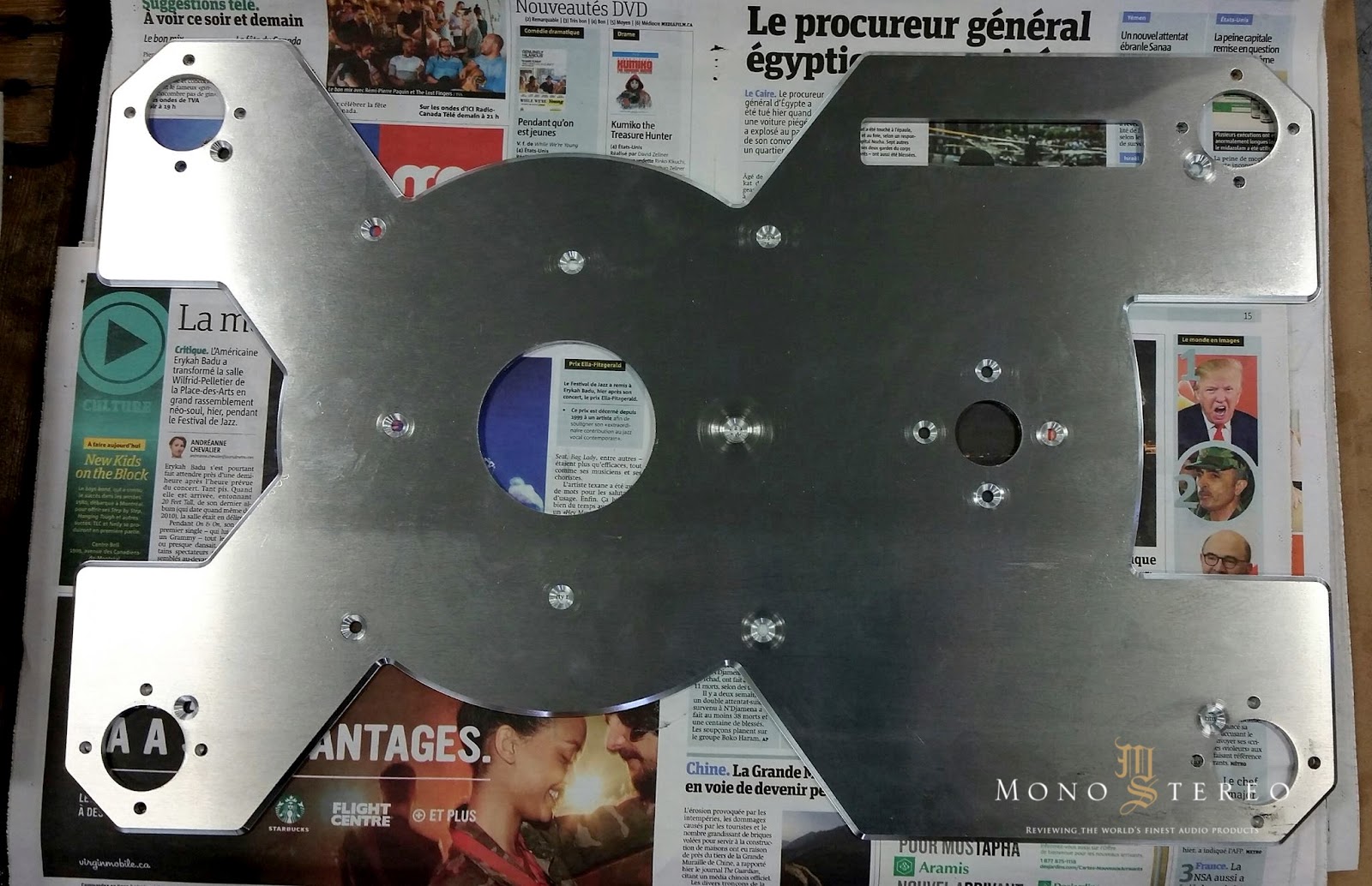 Machining the plinths for KRONOS PRO. This is a multistage operation that requires a pre-machining, assembly with the phenolic plates, dissassembly, graining, plating and final assembly. The result is a precision multi layered not resonant non altering platform.