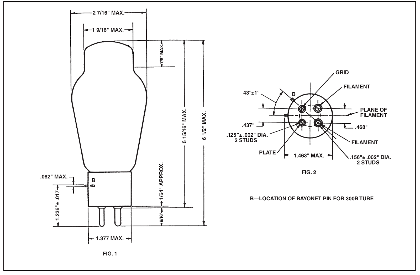 These vacuum tubes employ medium, four-pin thrust type bases suitable for use in Western Electric 143B or similar sockets. The 300-B tube has the bayonet pin so located that it may also be mounted in a Western Electric 100M, 115B or similar socket.