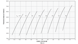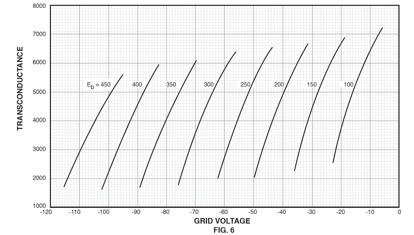 Plate-current characteristics for a typical tube are shown in Figure 3 as functions of grid bias, for alternating-current filament supply. The corresponding amplification-factor, plate-resistance, and transconductance characteristics are given in Figures 4, 5 and 6, respectively. When direct-current filament supply is used, and the grid and plate returns are connected to the negative end of the filament, the same characteristics are applicable if 3.5 is subtracted from the numerical value of each grid bias.