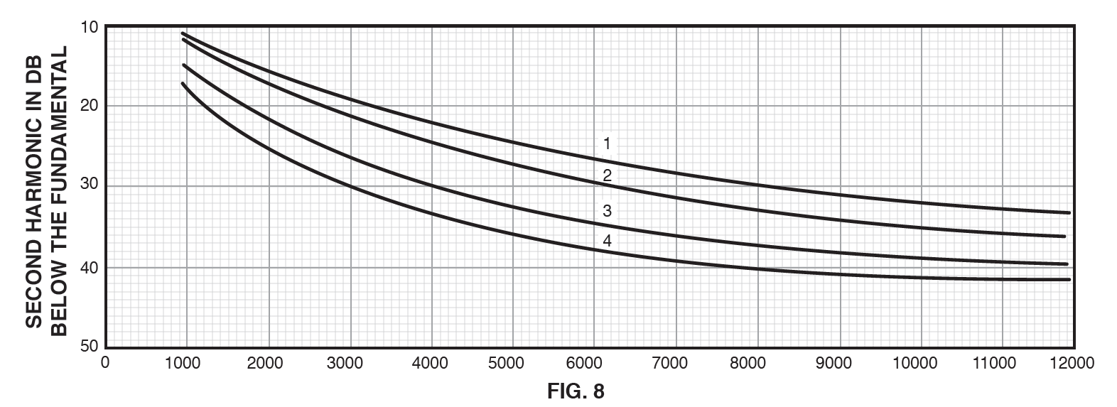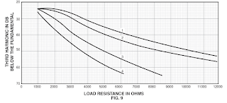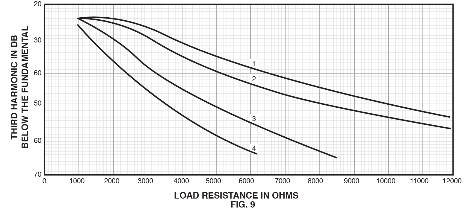 The variation of power output and harmonic levels with load resistance for several values of operating plate current are shown in Figures 7, 8 and 9, for a plate voltage of 350 volts.