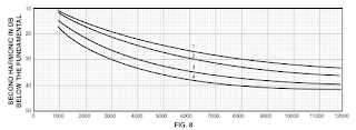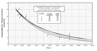The peak value of the sinusoidal input voltage, Egm, which gives the indicated power output, Pm and harmonic levels, F2m and F3m for each point in both the curves and the table, is numerically equal to the grid biasing voltage at that point. For a smaller input voltage Eg, the approximate levels may be computed from the following relations.