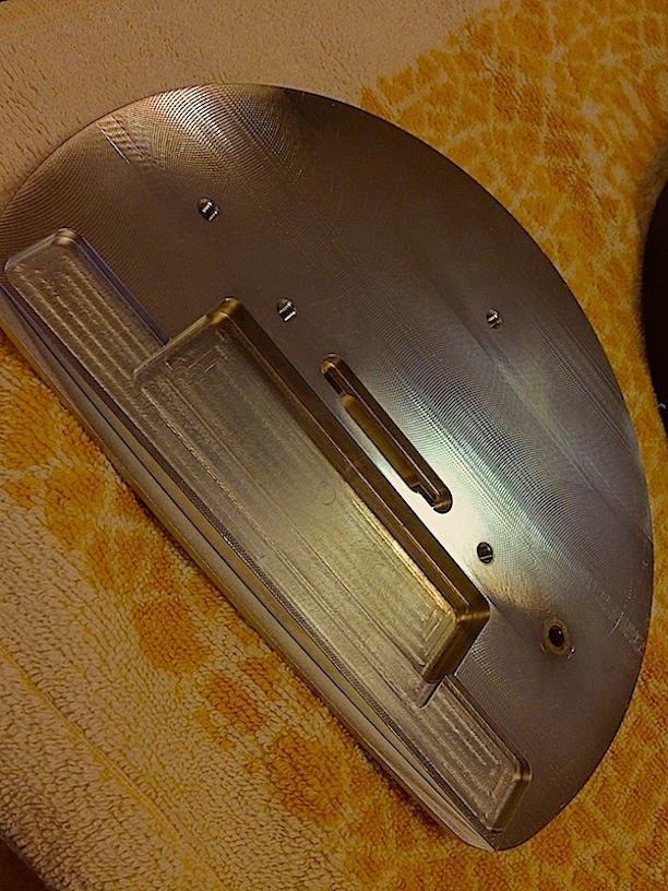 We are currently finishing up the silk screening job and hand assembling the first production main circuit board. We changed everything around during our last revision and optimization. We’ll report on how it goes! Below, you can see how the Panzerholz will make direct contact to a generous portion around the edges of the circuit board. The anti-vibration qualities of the Panzerholz material will thus be utilized to the extreme. The round holes are for the robust industrial specced precision control buttons. Thick steel will immediately surround the SD card upon insertion. You can see the thick round top plate here, viewed from the inside of the device. (This is the underside of the plate.) It is quite amazing how it rings like a bell because it is inherently very resonant material, but when mated to the Panzerholz, even without using any bolts, it is dead silent and doesn’t exhibit even the slightest ringing tail. It sounds like a rock buried in moist earth.