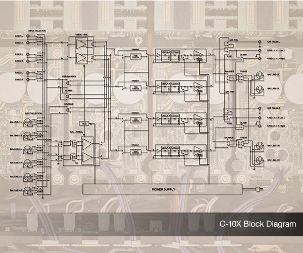 In order to embody the idea of abundant energy that accurately drives the power amplifier stage within sufficient margins, the power supply section of the C-10X is equipped with a powerful CI core type power transformer and seven custom specified 3,300 μF filter capacitors achieve dedicated highly stable power supply smoothing for each channel. Clean and stable regulation suppresses voltage fluctuations due to load.