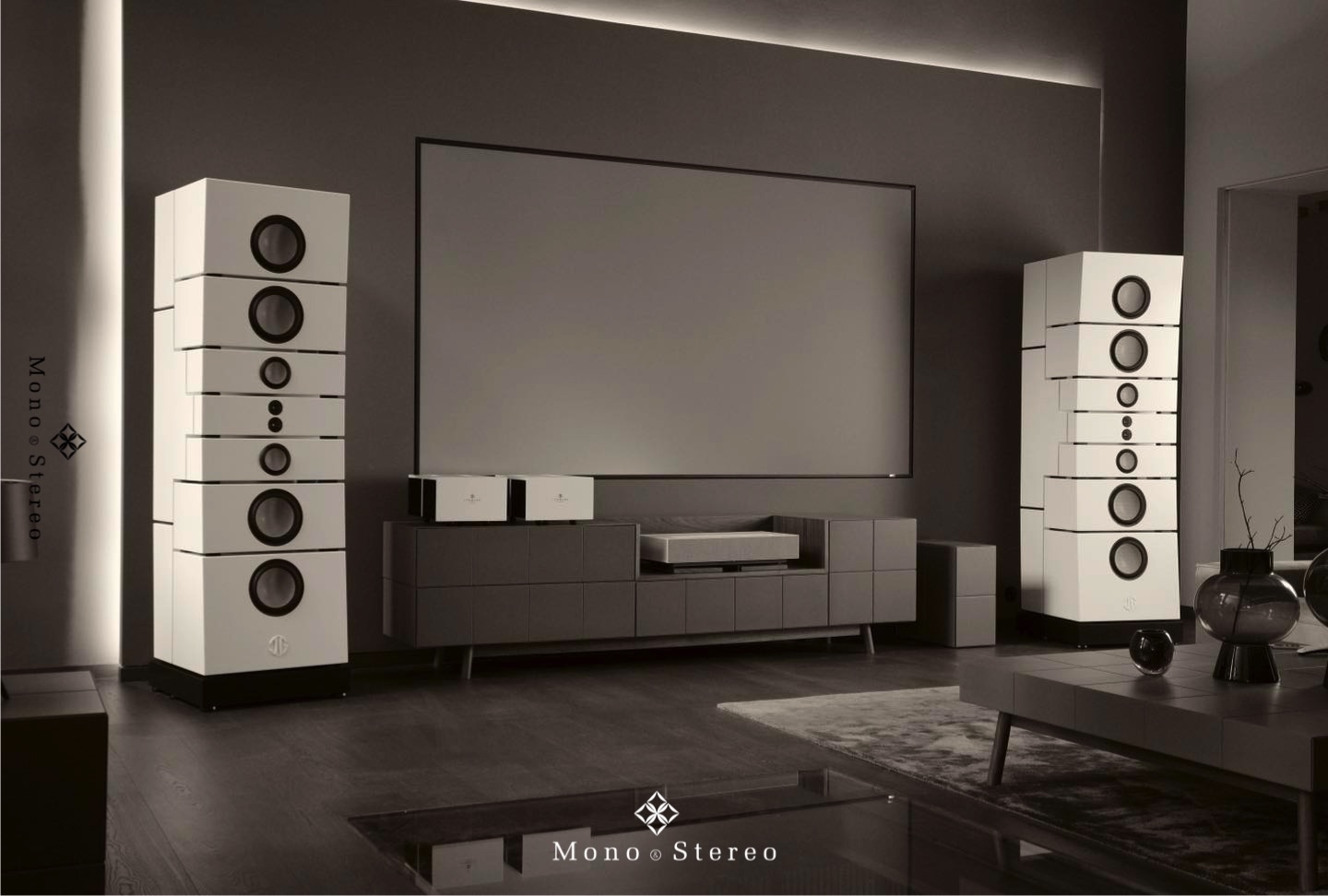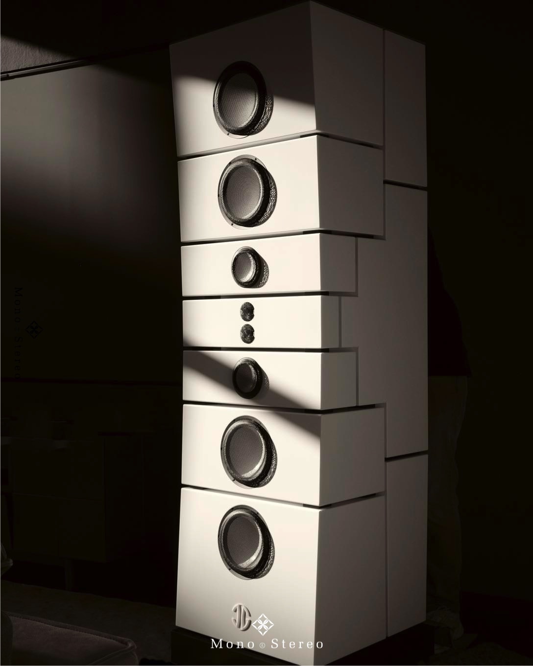 Lyravox KARLEMAGNE domesticated. The new Lyravox flagship speaker consists of 10 blocks of solid stone cabinet segments, weighs 380 kg per piece and costs € 368.000 per pair (full diamond version € 685.000). It is a whole new approach to superspeaker design: Lyravox never uses physical crossovers, believing that any speaker will sound superior when driven competently actively instead of passively.