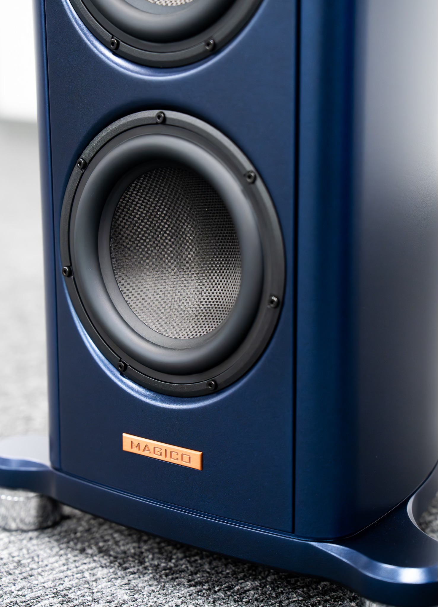 Magico S2 speakers in radiant Cobalt Blue Softec finish.