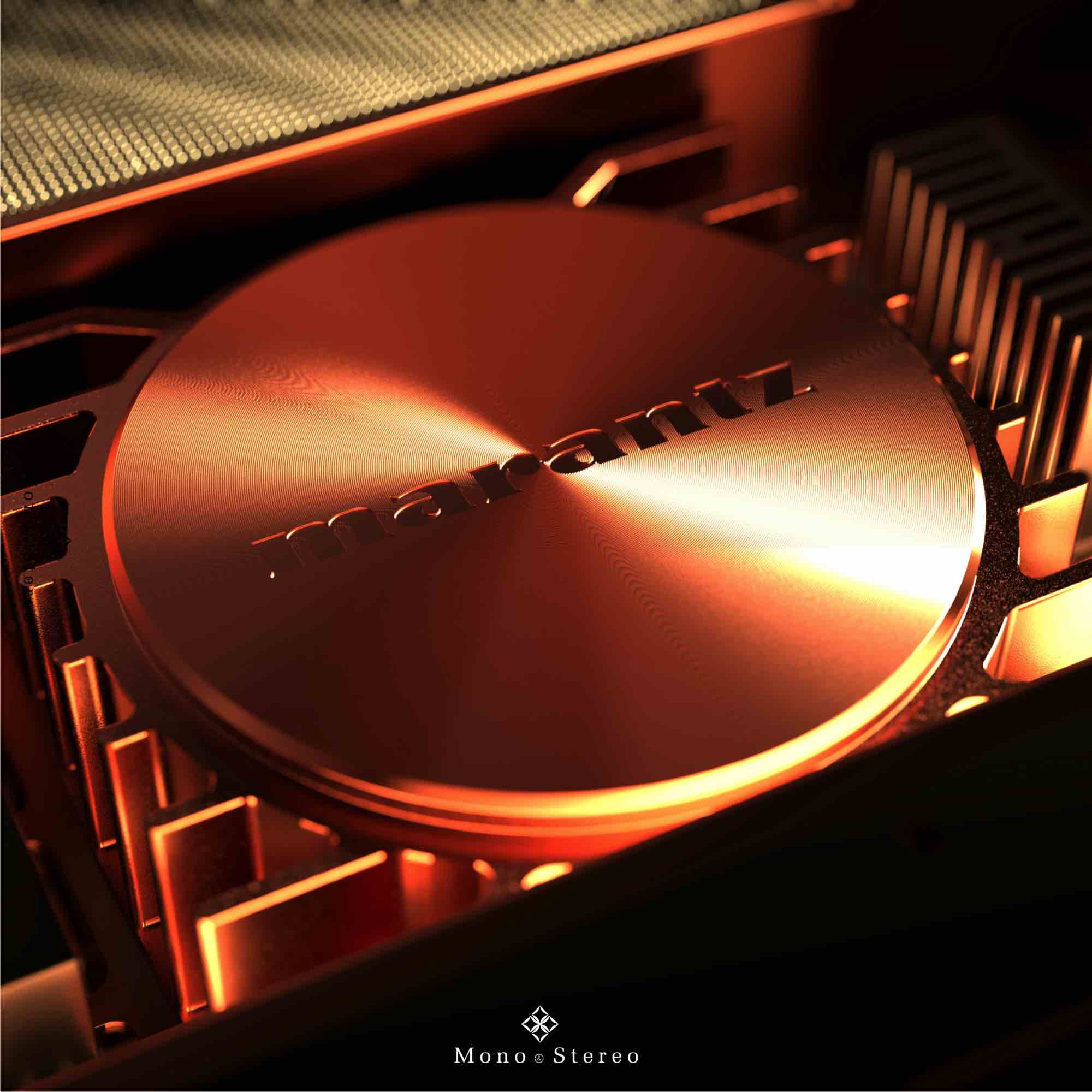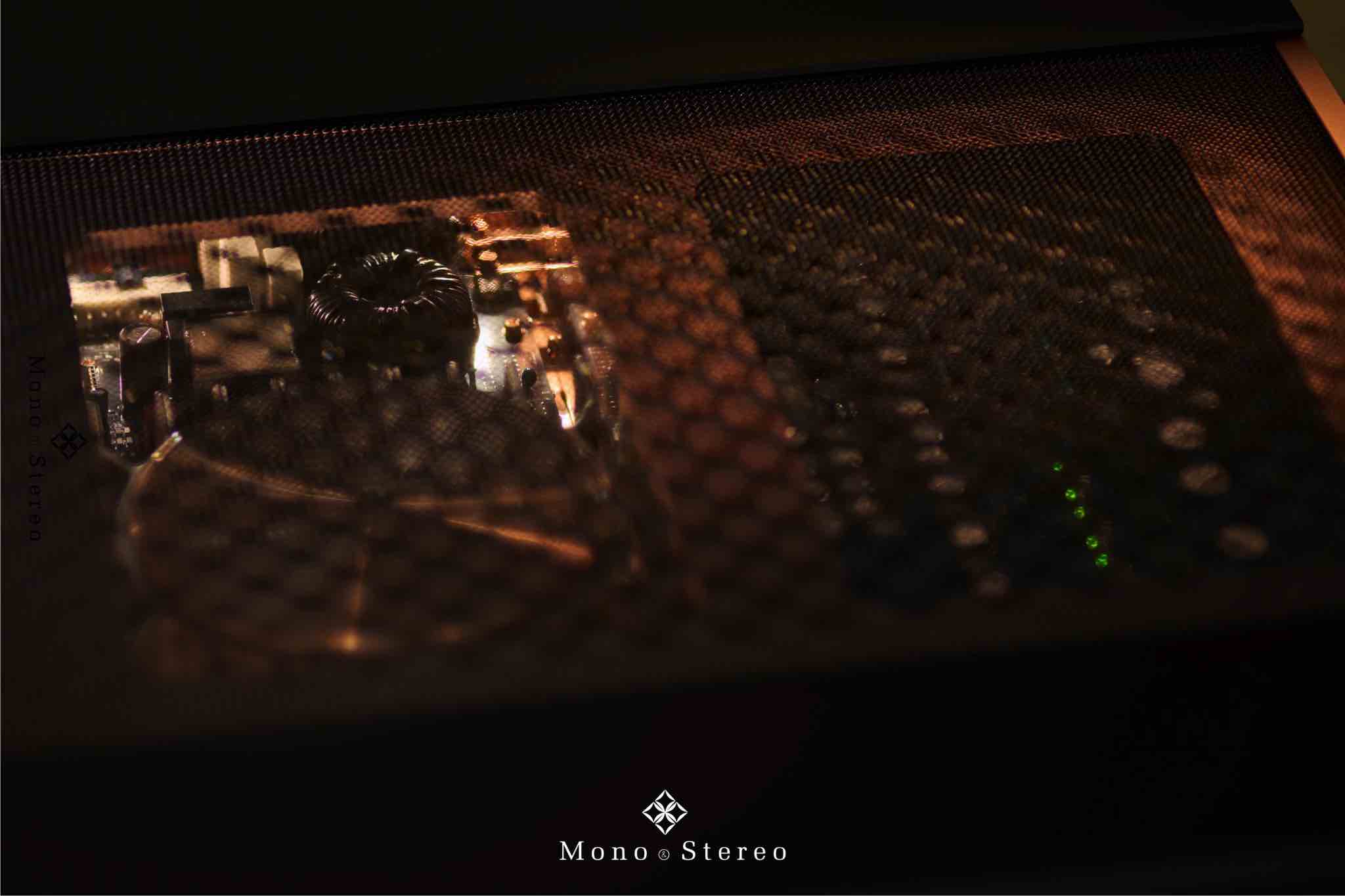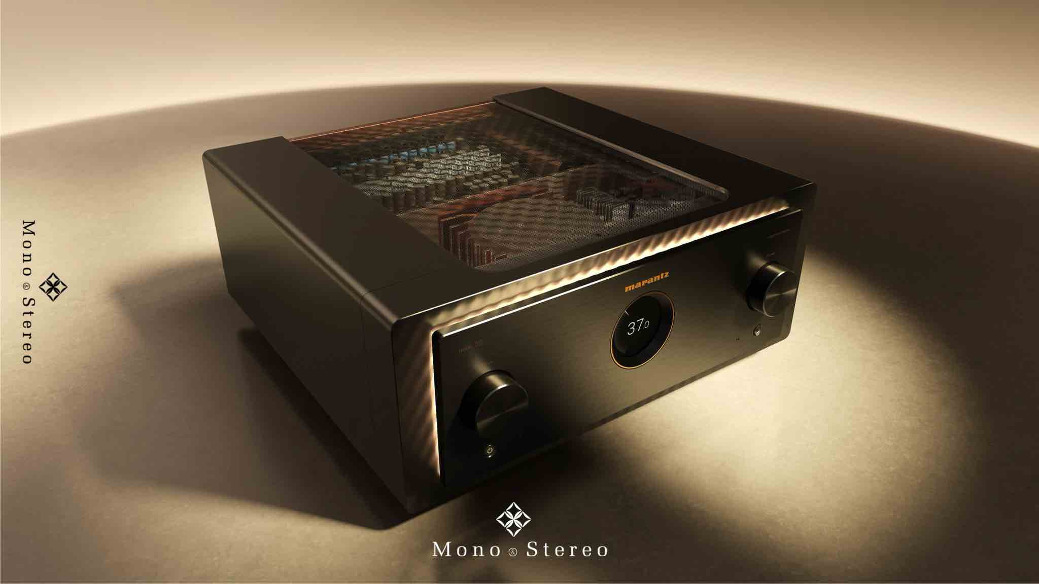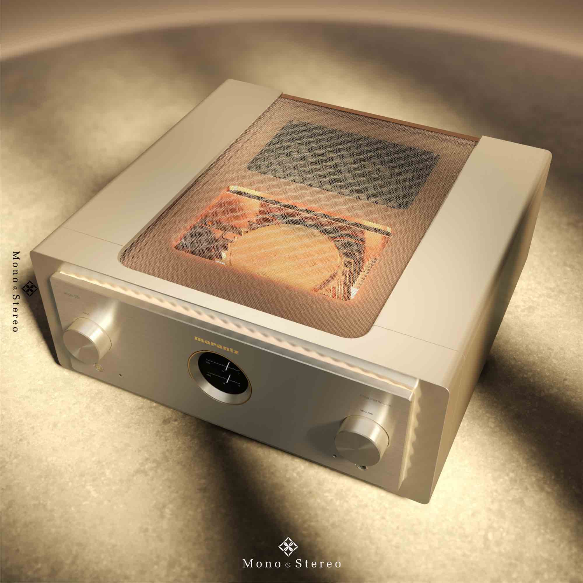 Marantz MODEL 10 is encased in a copper-plated, triple-layered chassis with illuminated mesh cover grille. Lighting inside the amplifier showcases the circuit boards, high-quality components, and specially designed transformer case.