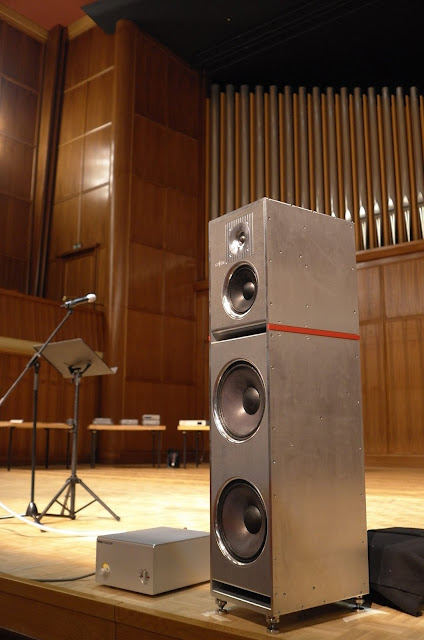 Nagra CLASSIC AMP and Stenheim Alumine Five (still prototypes but promising) at Salle de Musique La Chaux- de-Fonds. A very transparent system to demonstrate the qualities of the beautiful recordings made by Jean-Claude Gaberel, some of them in this very room — at Salle de Musique La Chaux- de-Fonds.