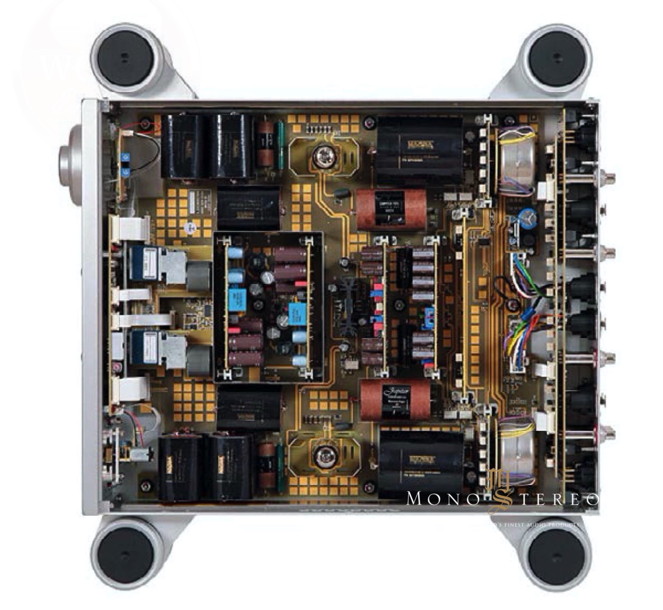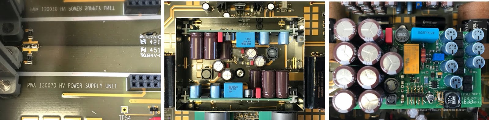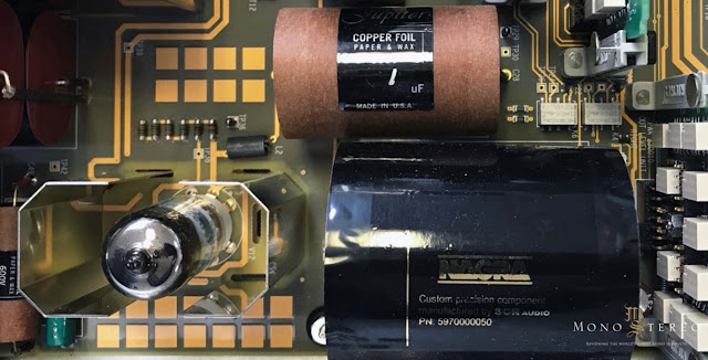All printed circuit boards are varnished, gold plated epoxy glass circuits. Two toroidal transformers provide all necessary low voltage signals, which are rectified, filtered and deeply regulated. Banks of 22000uF Rubycon high-temperature electrolytic capacitors serve as pre-filters before the voltages are routed to various circuit boards, which generate the required voltages for each circuit.