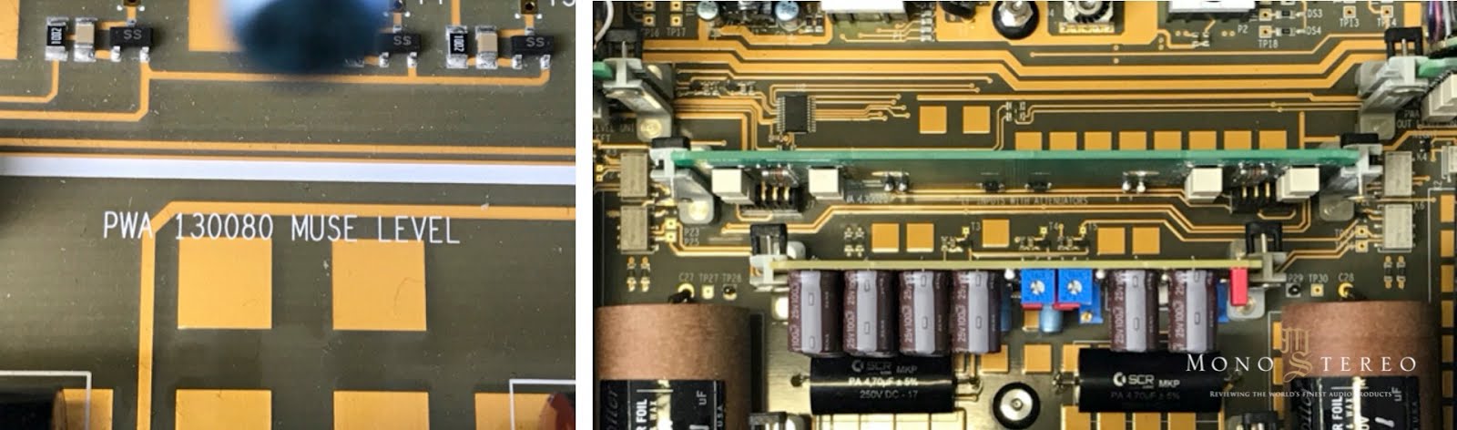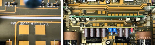 Location of one Nagra transformer board on the main board (left), left channel Nagra transformer board (middle) and switching relays (right).