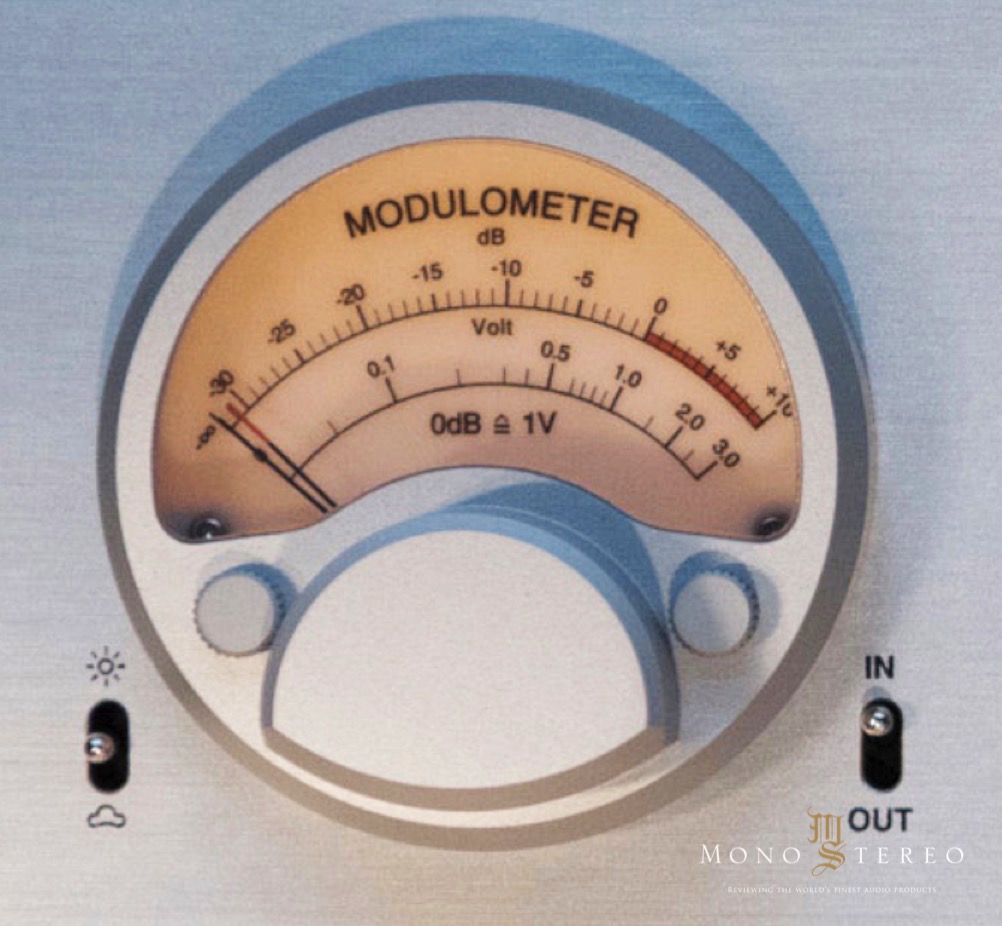 And of course, there is no full-blooded Nagra instrument without the modulometer. The HD PREAMP adopts a new modulometer, which is a duplication of the Nagra PL -P preamplifier modulometer. The two pointers show the left and right input or output level in volts and in dB, 0dB corresponds to 1V RMS. The switch on the left makes the backlight more or less intense and the switch on the right selects input or output monitoring.