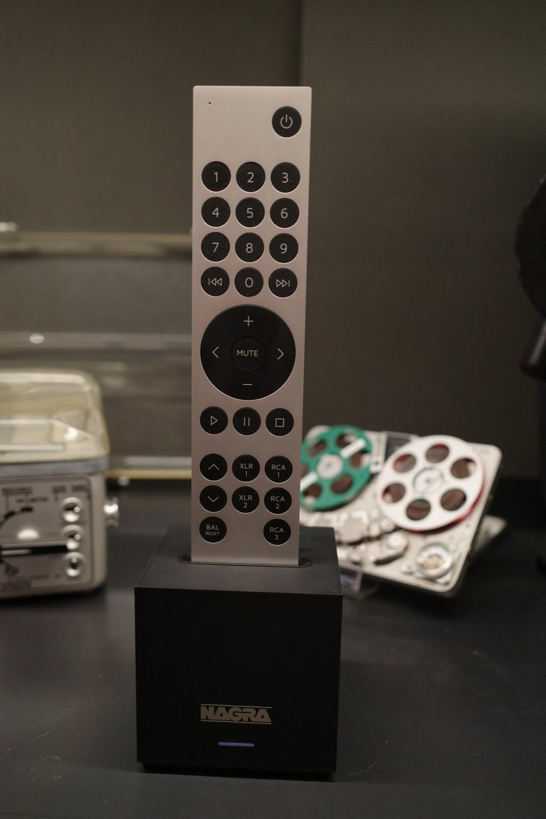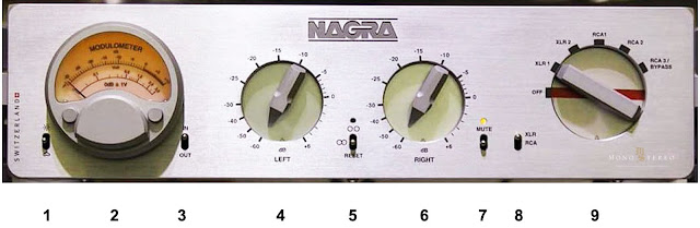 1. Modulometer light intensity switch. Push up for more intensity, push down for less intensity. There are 7 intensity levels. 2. Nagra Modulometer. Indicates input or output level in dB. Reference 0 dB = 1 V 3. Monitoring selection switch between input or output level 4. Left channel volume control. 5. Synchronization switch of the two volume controls, warning LED for pre-heating and channels out of balance 6. Right channel volume control 7. “Mute” switch with reminder LED 8. Selection switch between RCA or XLR outputs 9. Nagra main rotary selector