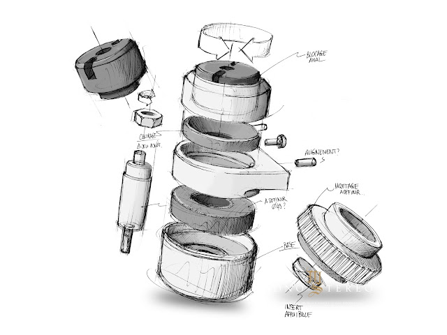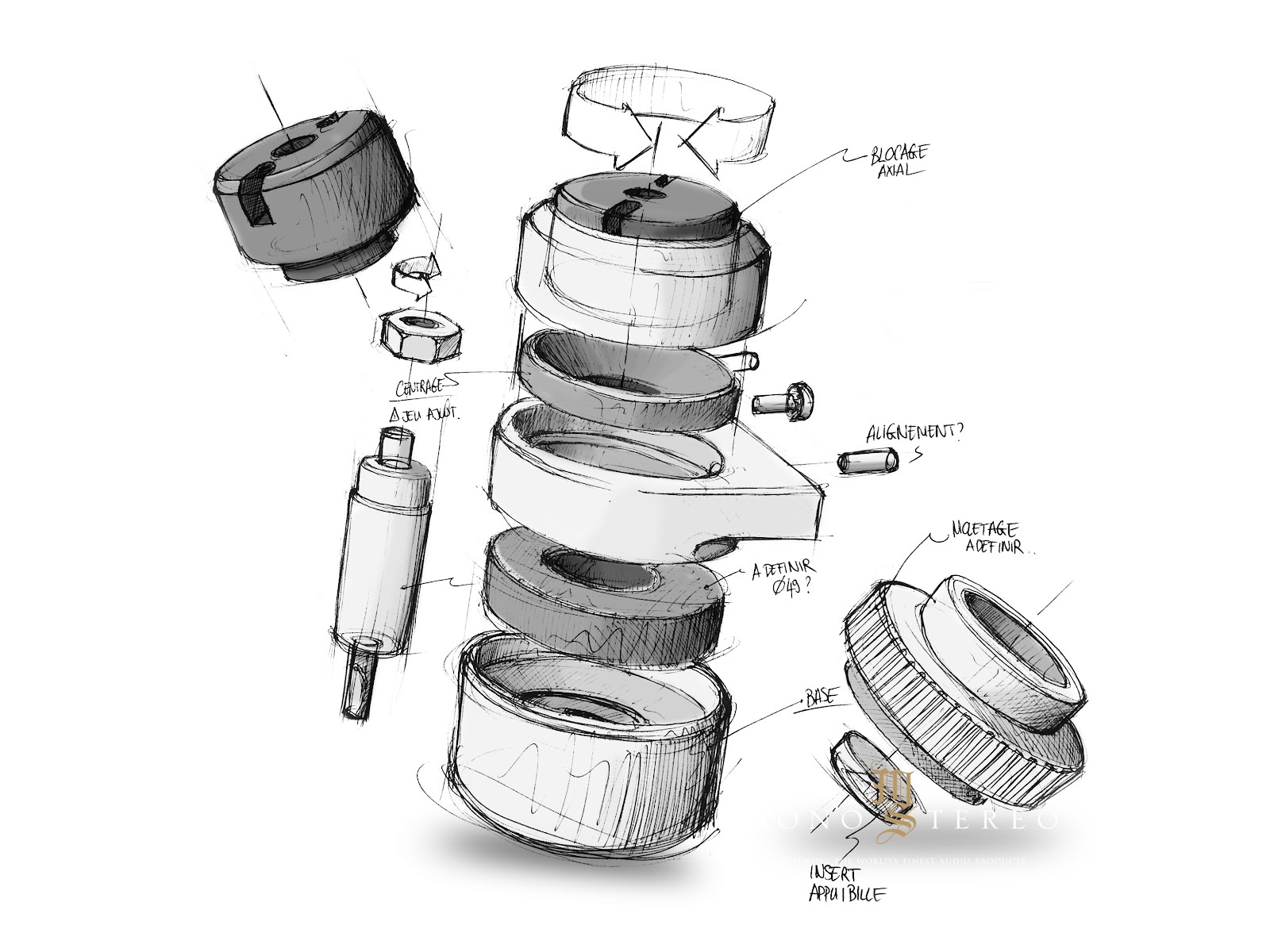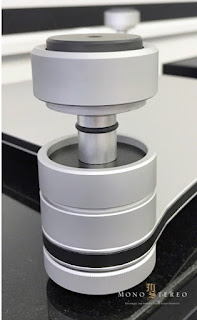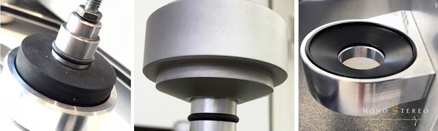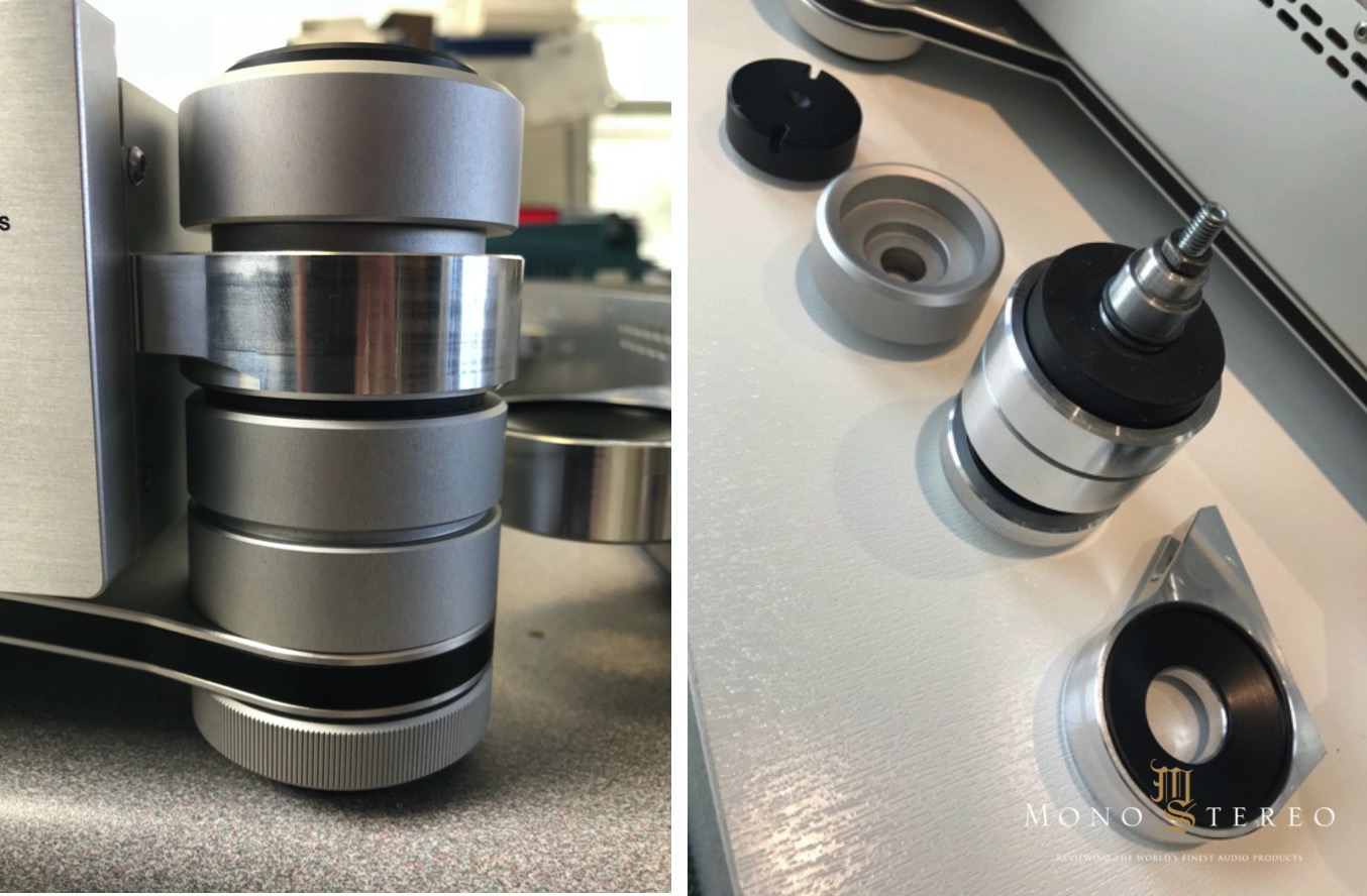 The column consists of a metal column with threaded ends for the adjustable foot at the lower end and the coupling ring at the upper end. The coupling ring tightens the ear attached to the chassis around the column. The bottom of the coupling ring and the polymer piece at the top of the ear adopt a tapered profile to allow the chassis to center itself on the column. A small rubber O-ring prevents metal-to-metal contact with the ear. The underside of the ear is placed on a large sorbothane ring whose damping properties have been determined after listening sessions. The ring with double height in the middle tightens the column to the plate that connects all four columns. Instead of just aluminum, the plate consists of a sandwich of a thick sheet of a mixture of phenolic resin and paper fibers, selected after listening sessions and, preferred to linen fibers, between two thin aluminum sheets. All plates are ordered separately and then joined together with seven screws. The screws are tightened precisely in order to distribute the mechanical loads easily so that no resonance peak occurs at certain frequencies.