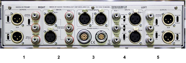 1. XLR and RCA outputs right channel 2. XLR and RCA input right channel 3. “BYPASS” XLR inputs and power supply LEMO connectors 4. XLR and RCA inputs left channel 5. XLR and RCA outputs left channel