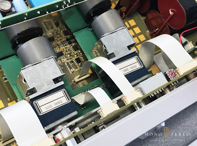 The motorized Blue Velvet potentiometers are manufactured by Alps. These components, known for their precision in pairing tracks and their reliability over time, are not used for volume control. Instead, they send a signal to the microprocessor about the position of the left and right volume buttons, so that the microprocessor can switch the windings of the output transformers by relay and adjust the gain of the Muses circuit accordingly.