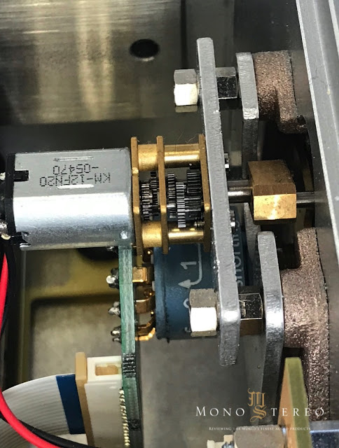 Above is a view of the mechanism at the back of the Nagra main rotary selector. The tiny motor on the left is activated when a selection is made with the remote control.