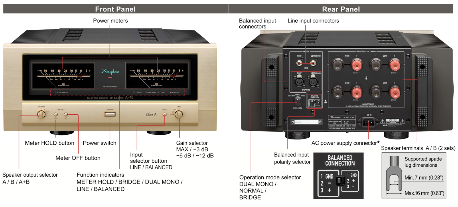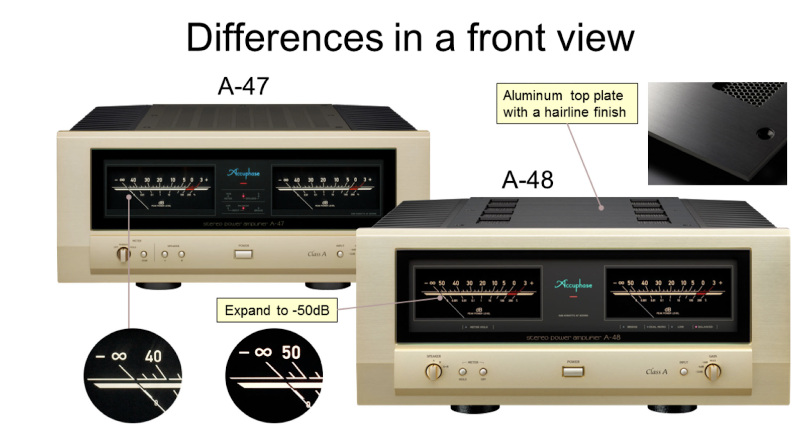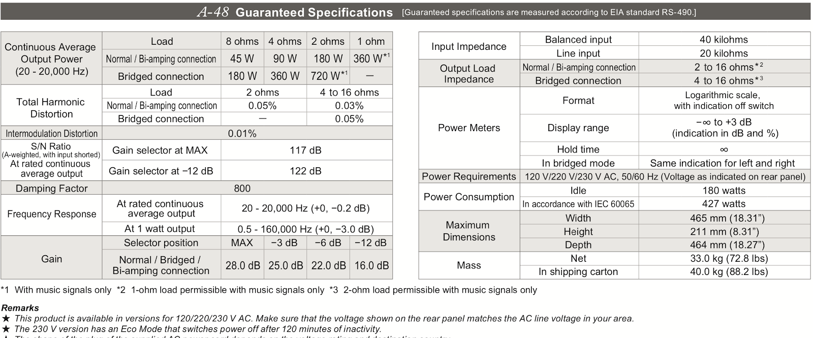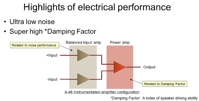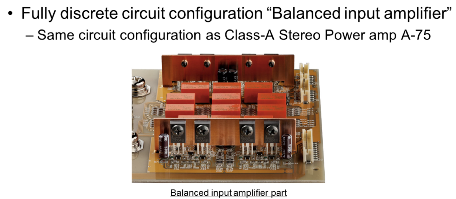 The A-48 features the latest instrumentation amplifier topology. It consists of a complete balanced input amplifier block and a power amplifier block. Featuring a six-fold parallel push-pull architecture with power MOS-FETs, as well as ideal gain allocation realized with discrete semiconductors in an instrumentation amplifier configuration, the A-48 harnesses a wealth of advanced technology. Its outstanding performance is exemplified by a signal/noise ratio of 117 dB, output of 360 watts into 1 ohm (music signals), and a damping factor of 800. The newly designed output protection circuit can detect any short-circuiting of the speaker terminals, for complete peace of mind. This power amplifier is the ultimate instrument for immersive music appreciation on the highest level.